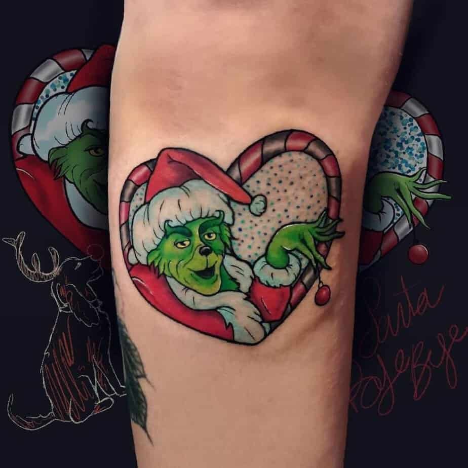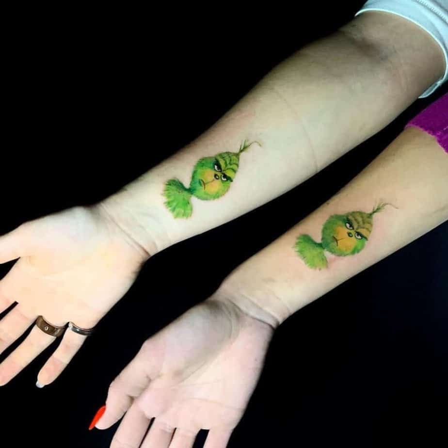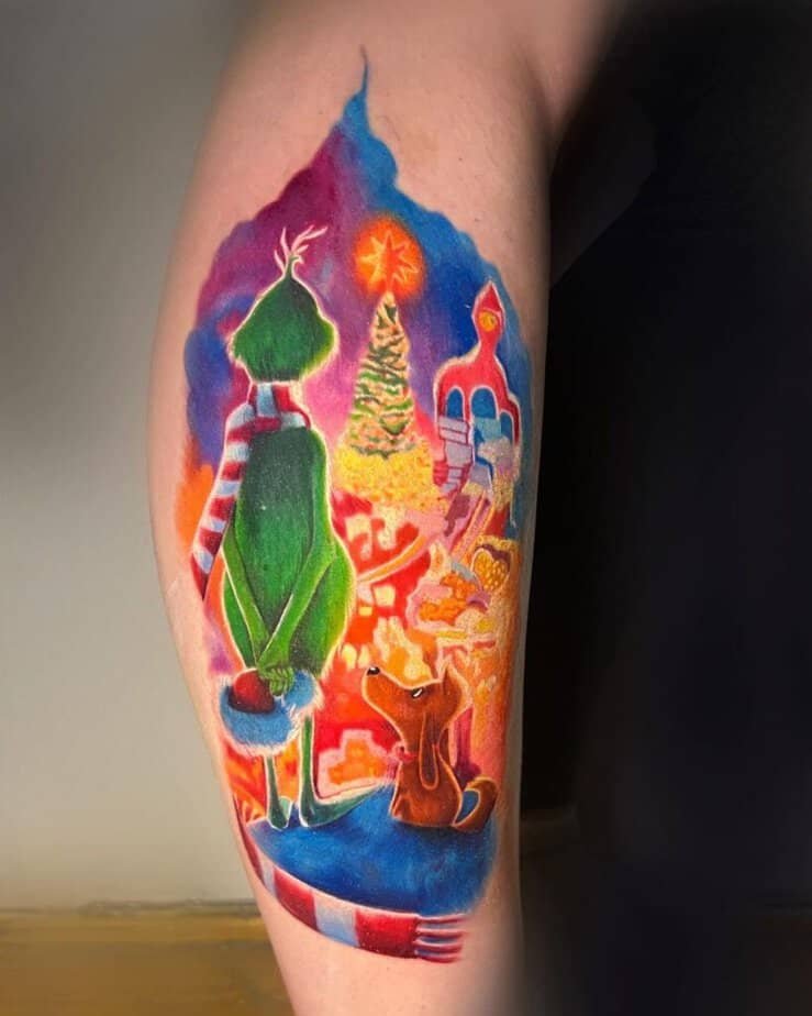 Want to include your favorites from the movie? You can get a little group portrait with Cindy-Lou Who and Max the dog — it’s sweet and a great nod to the whole story. Matching tattoos are also a lovely idea if you and a friend both have a soft spot for that moment when the Grinch’s heart grows three sizes; you can do that as a small symbol or an illustrated scene. Watercolor touches give the character extra life if you’re feeling playful, while a big, colorful Grinch can go full-on festive if you secretly love the holiday chaos.