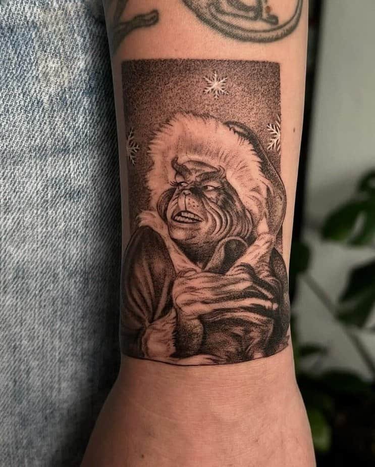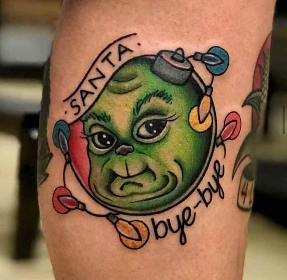 If you’re into realism, there are black-and-gray options that look almost like a photograph — you can already tell he’s plotting something, and those sly eyes are everything. Or maybe you like sketch-style tattoos; they can look loose and playful while still capturing his whole mood. For a laugh, a small tattoo of baby Grinch saying “Santa bye, bye” is such a run-for-your-money reference — it’s silly and instantly recognizable. And if you like subtle hints instead of full faces, a hairy green hand clutching a tree ornament says “Grinch” without screaming it.