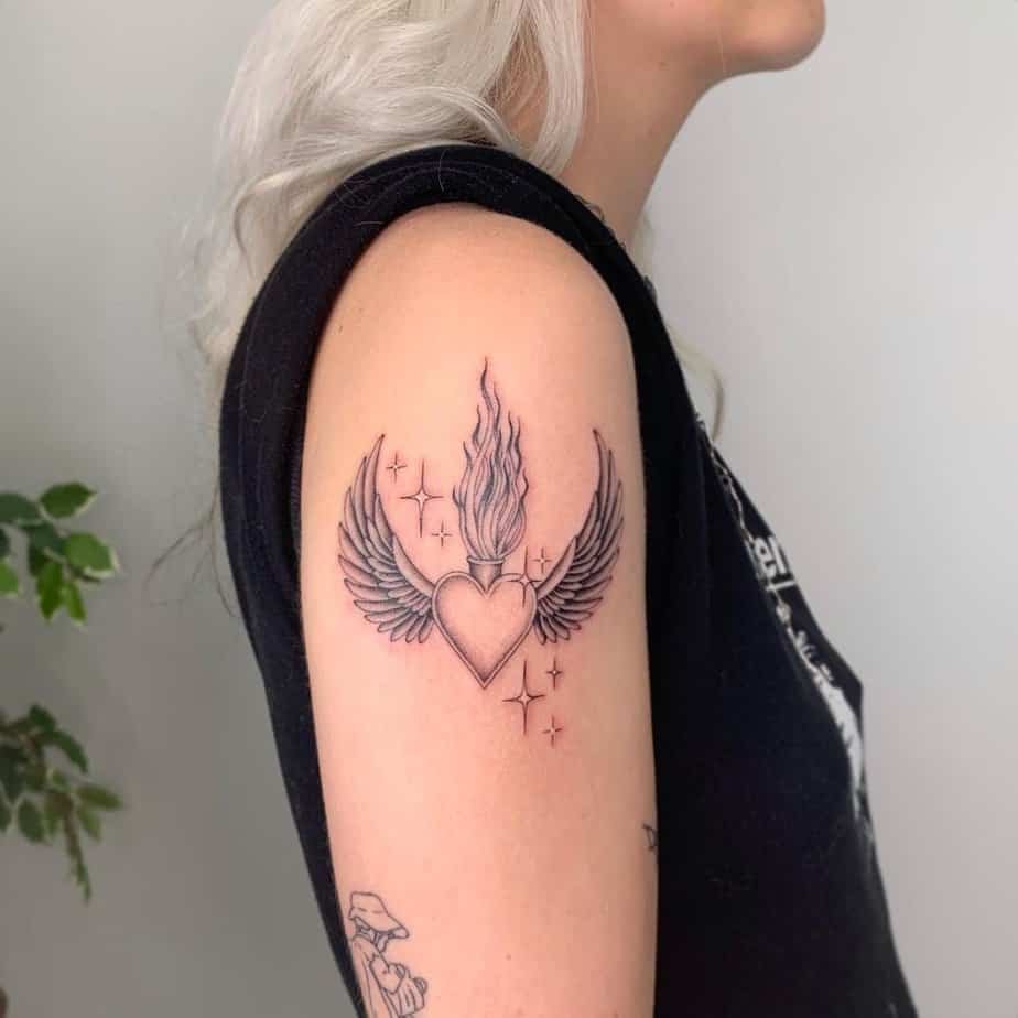A fiery winged heart on the shoulder is loud in the best way — bright colors, big energy, and a statement that you’re not afraid of heat. It reads like motion and temperament, sort of like wearing your spirit on your sleeve (or shoulder, in this case).