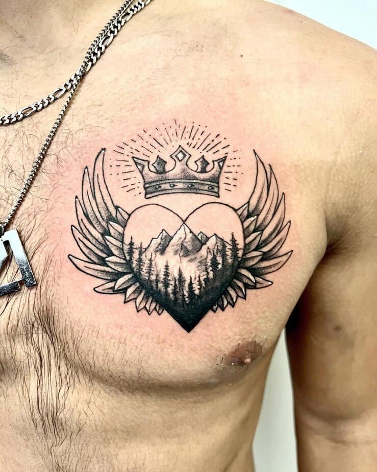 This crowned heart with wings and a little landscape turns your body into a tiny fantasy world — mountains, trees, and a crown all say your love is both grounded and noble. It’s like carrying a whole little fairytale on your skin, and who doesn’t want a bit of personal magic?