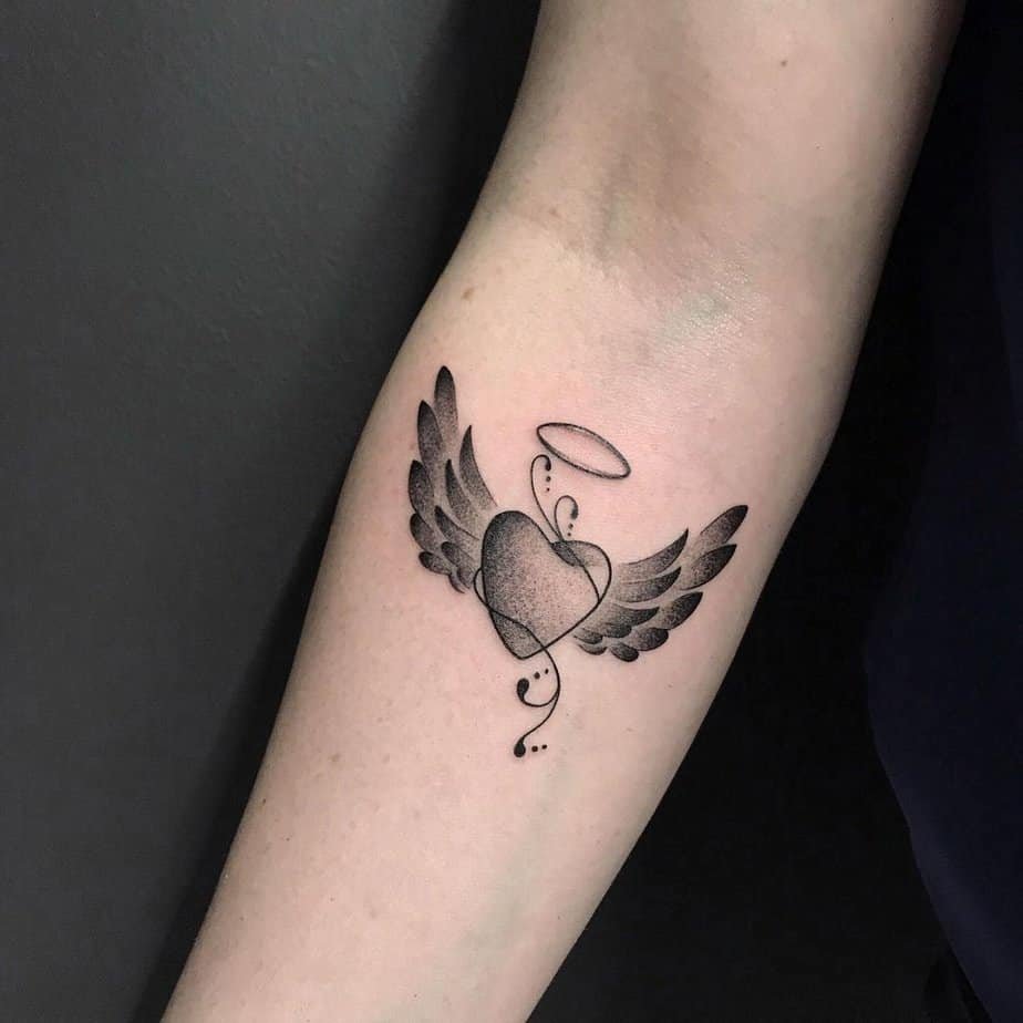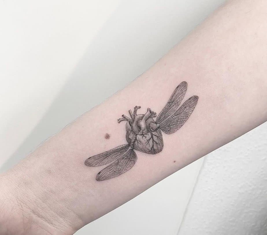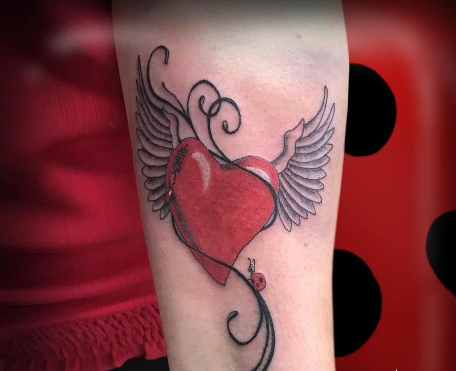 An intricate winged heart on the forearm is basically a conversation starter in ink form. The detailed wings and delicate heart show there’s a story behind it, and the forearm placement means you’ll see it and other people will, too. It’s like wearing your history where you can glance at it daily — perfect for someone whose love life has lots of chapters.