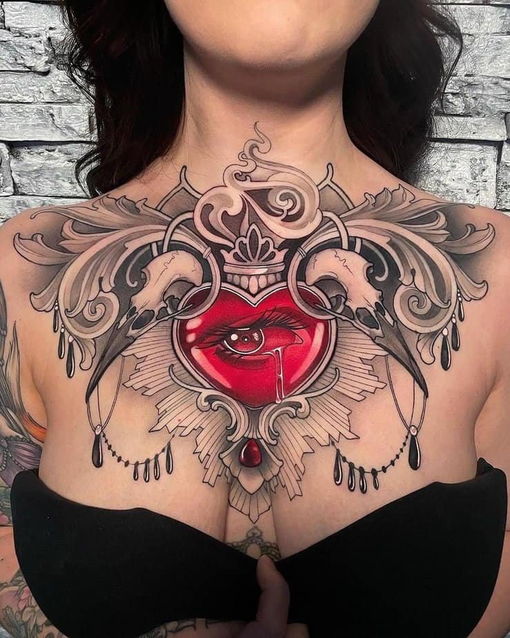 If you adore detailed design and theatrical vibes, the gothic ornate heart is for you. It’s elaborate, moody, and reads like an heirloom piece — bold enough to be the centerpiece of your chest. It’s not shy; it’s an artful declaration that you love big and look great doing it.
