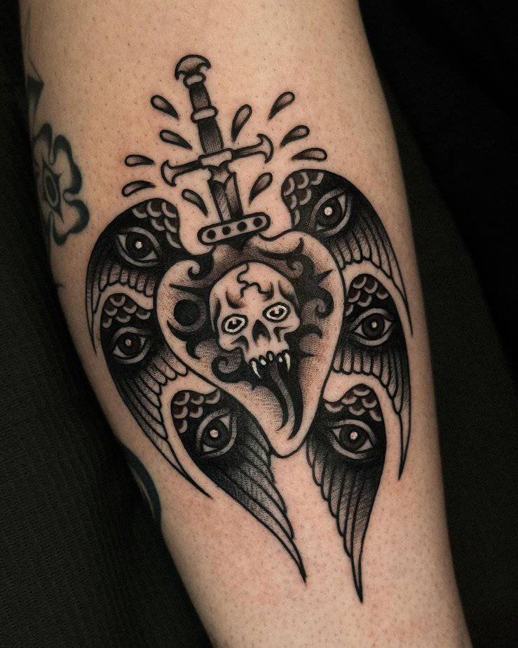 This traditional design mixes old-school flash with a rebellious twist: a heart pierced by a sword, wings to lift it, and even skull or eye motifs on the wings for extra attitude. It blends classic tattoo language with a modern dare — perfect if you want something timeless but not tame.