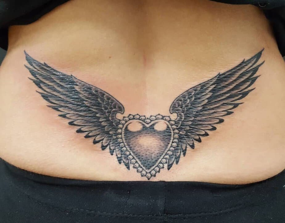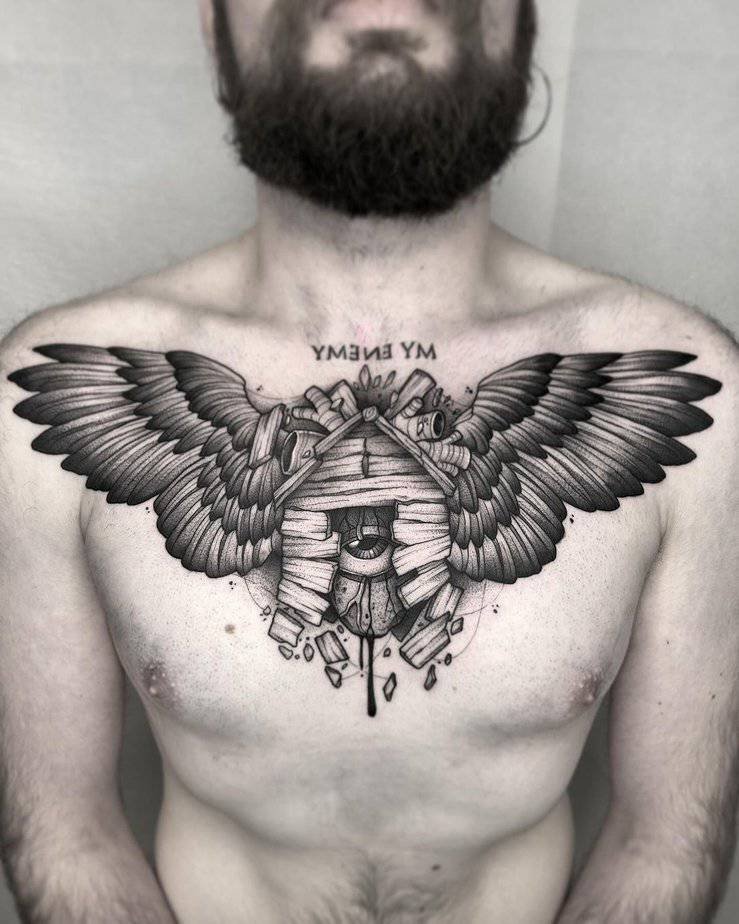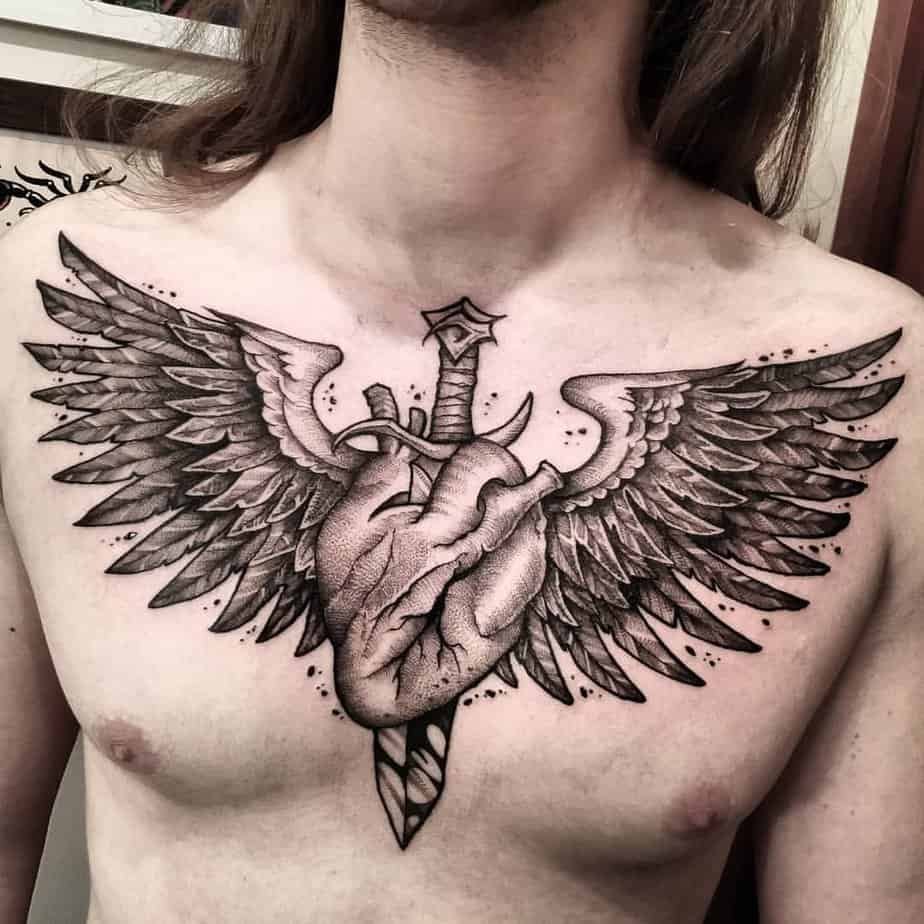 This one’s for when you want to announce yourself. A bold chest piece with a winged heart spreads across your sternum like a statement and doesn’t leave much to the imagination: you mean business. It’s fierce, dramatic, and the kind of ink that turns heads. If you’re the person who wants their body art front and center, this is such mood.