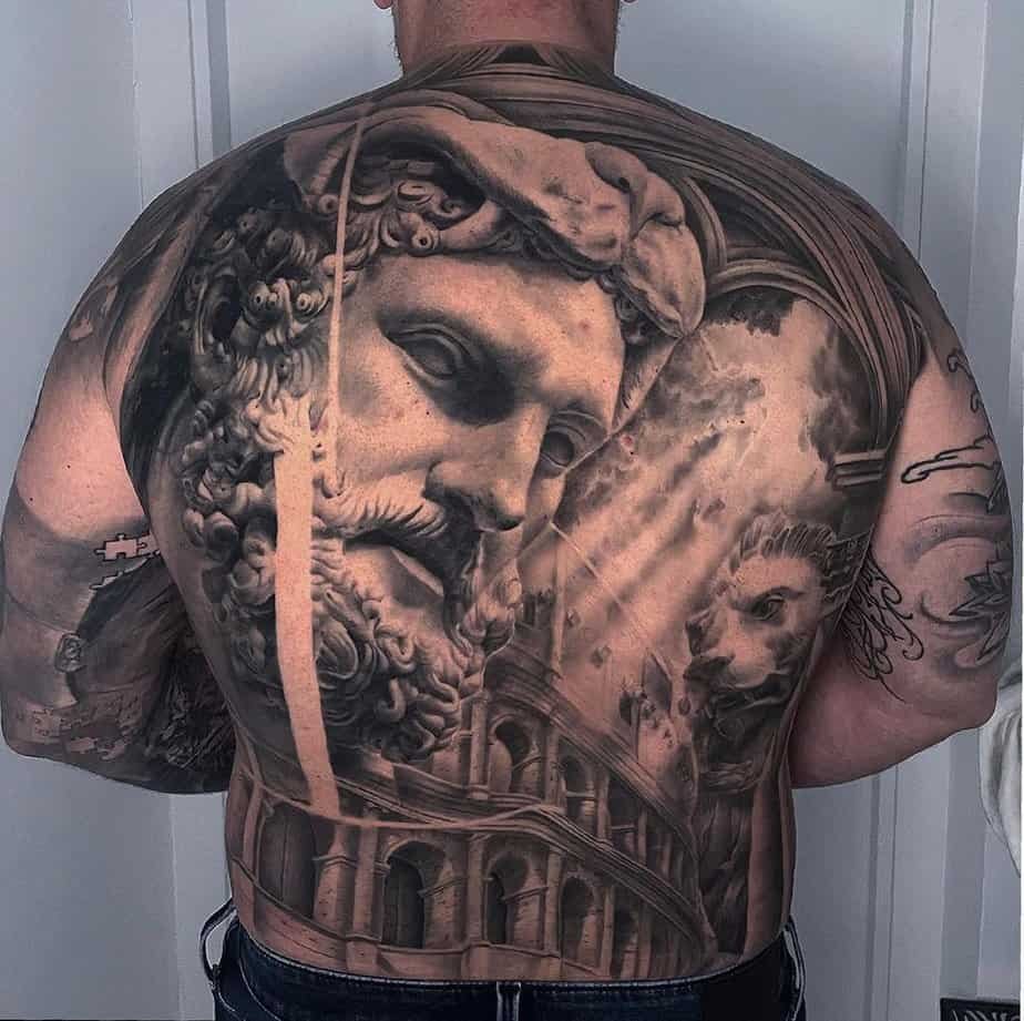 This expansive back piece splits the scene between Hercules and a lion with sunlit Greek architecture behind them — grand, cinematic, and heavy on symbolism. It’s the kind of tattoo that turns your back into a stage for myth and determination.