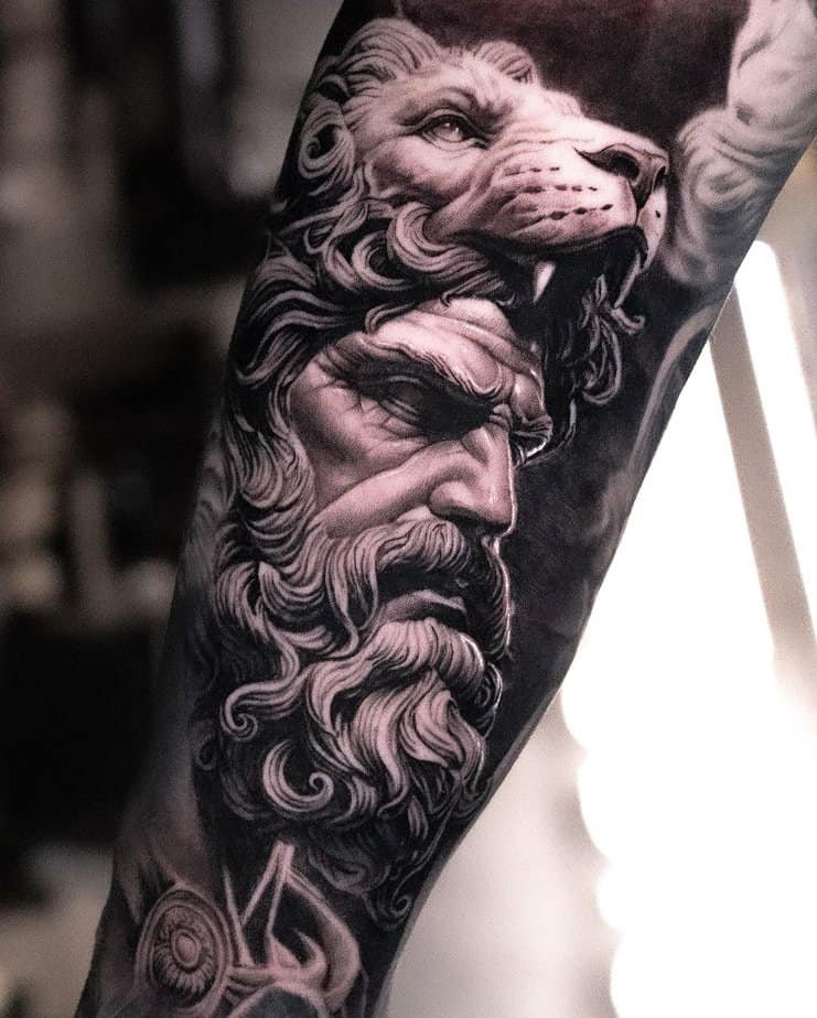 This half-sleeve looks straight out of a museum — Hercules carved in ink, hair and features so sharply defined they almost pop off the arm. Above him, a lion is all ferocity, and beneath them a Greek building gives the whole thing context, like a scene from an old epic. It’s dramatic in the best way and reads like a wearable work of art.