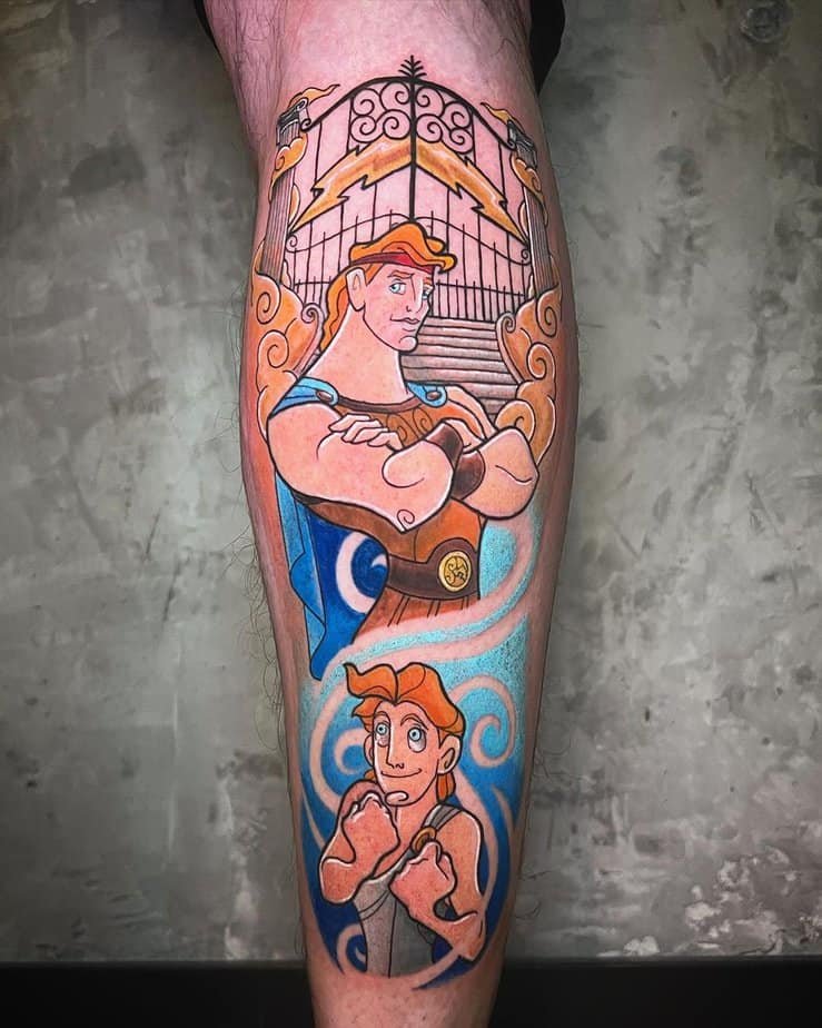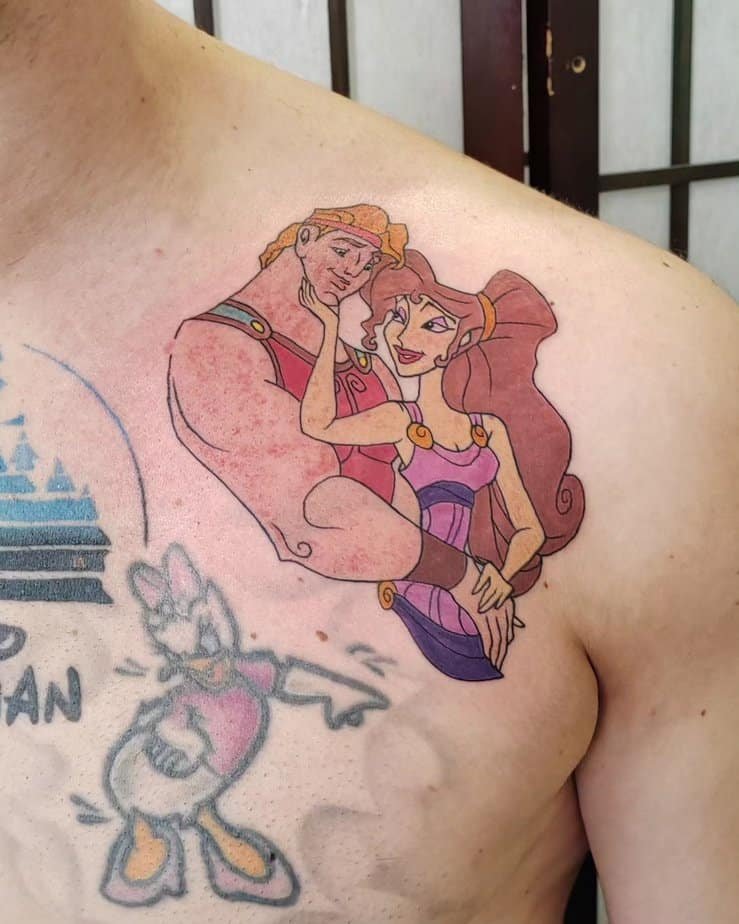 This colorful chest tattoo of Disney’s Hercules and Megara is sweet and full of heart — they’re embracing, eyes soft, and it makes the myth feel warm and personal. If you grew up with the movie or just love a romantic take on hero stories, this is such a charming option.
