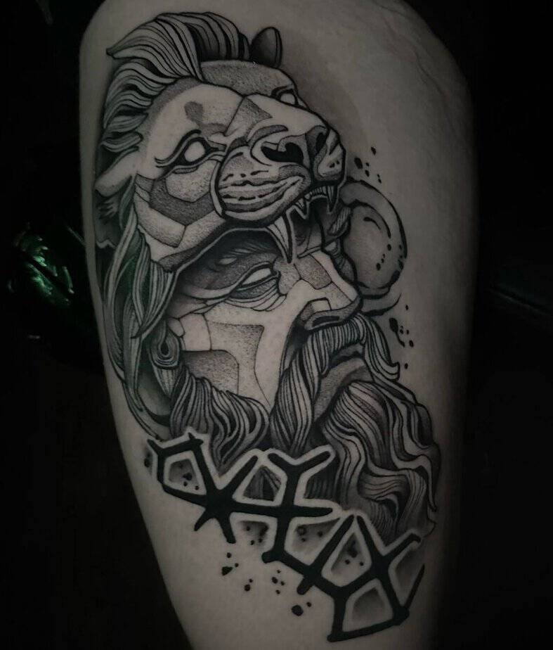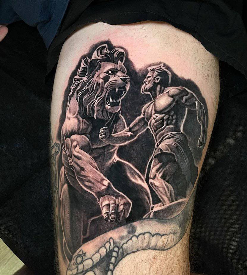 Take a beat to look at this stunning black-and-gray Hercules — the shading is ridiculous in the best way and the tiny details make him feel almost alive. His gaze is intense, and the lion’s head added to the piece just cranks up that majestic energy. The whole tattoo feels like careful, meticulous storytelling: strong, symbolic, and impossible to ignore.