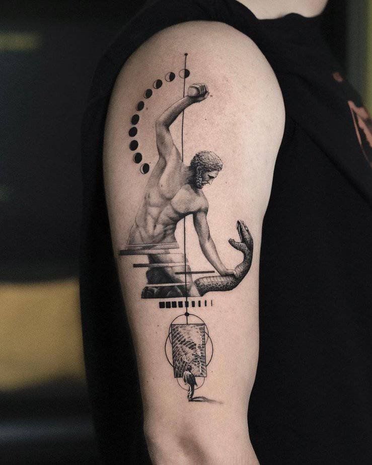 This one looks carved — the gaze, the hair, the beard all so precisely rendered you could almost trace it with your fingers. If you’re into classical sculpture vibes and clean, detailed tattooing, this is a gorgeous reference.
