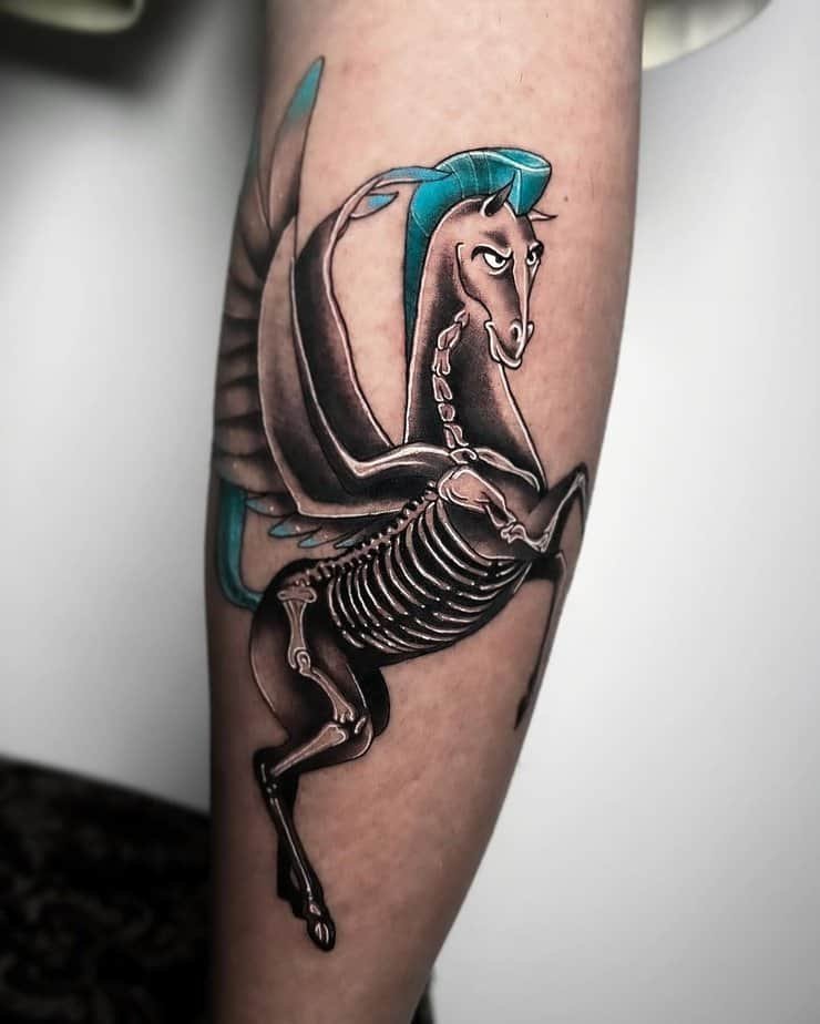 This Pegasus is so cool — turquoise mane and tail, with the skeleton subtly showing beneath. Pegasus tattoos are all about freedom and inspiration, and this one feels like a reminder to rise above whatever’s weighing you down. There’s also this muse energy, like a tiny push to make something creative today.