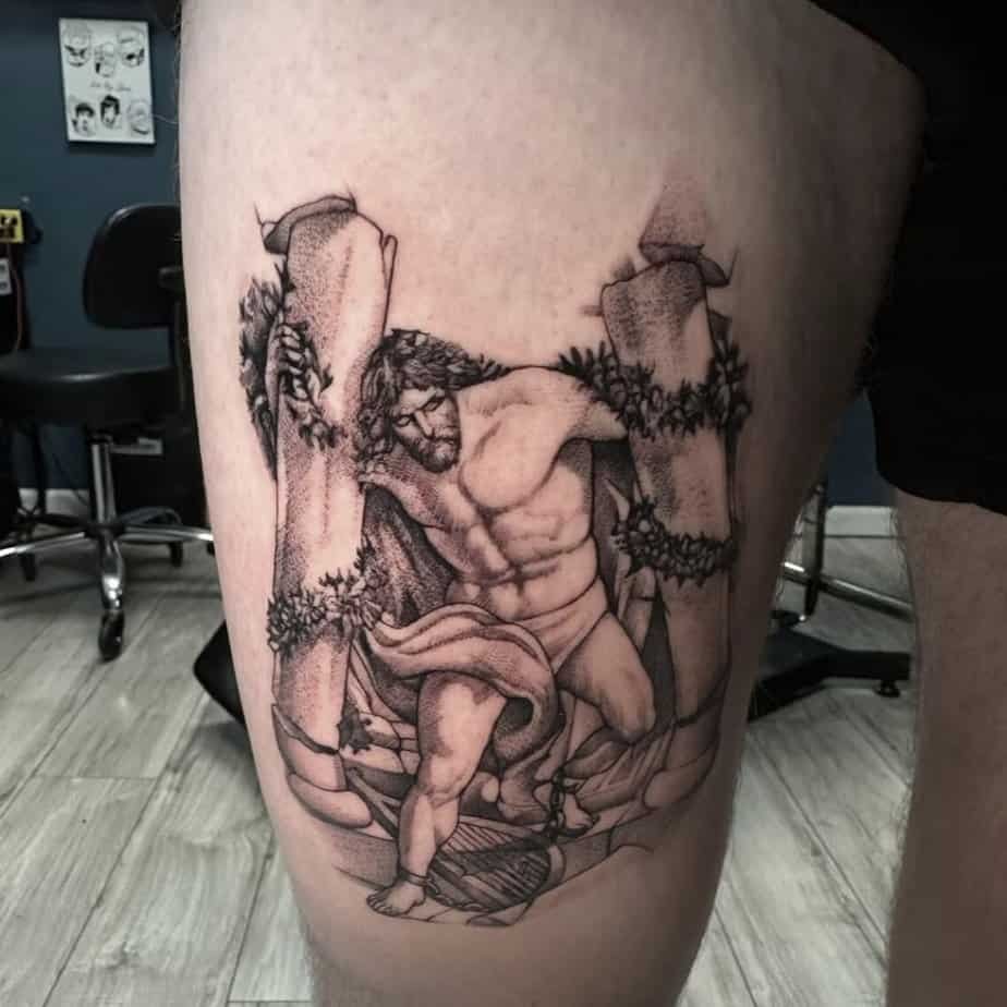 This black-and-gray piece shows Hercules holding a broken pillar — a neat symbol of endurance and refusal to quit. It’s stripped down but powerful, great for someone who wants their ink to say: I endured and I kept going.
