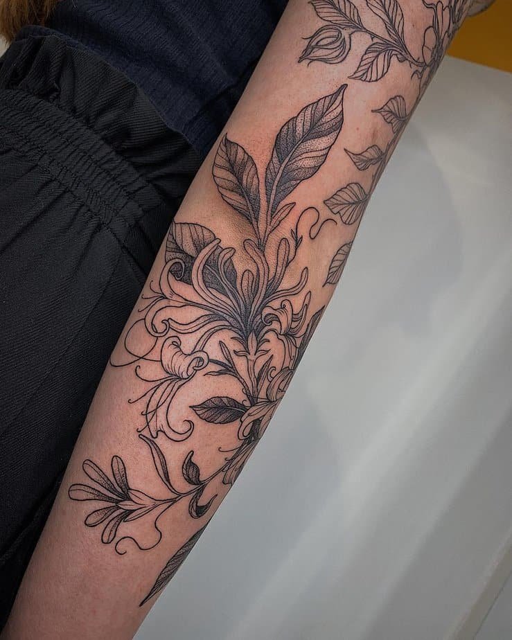 Full sleeve honeysuckles? Yes please. The mix of dotwork and black-and-gray here gives it depth and texture, and the whole thing feels like a floral narrative about love’s complicated beauty. It’s a big statement about finding wisdom and resilience through tough times — like your story inked in flowers.