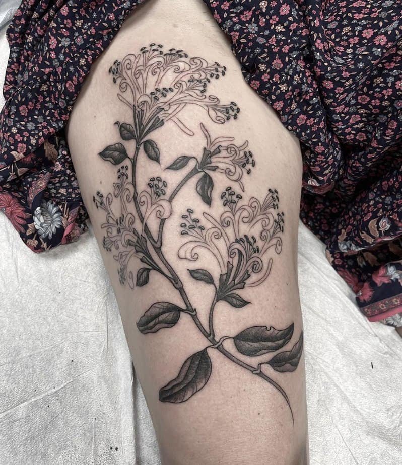 A thigh piece in blackwork with Japanese honeysuckle vibes feels both timeless and a little edgy. It’s the kind of tattoo you can keep private or show off when you want — and it carries this idea of inner strength, resilience that lives inside even during dark times. Pretty powerful for a floral design.
