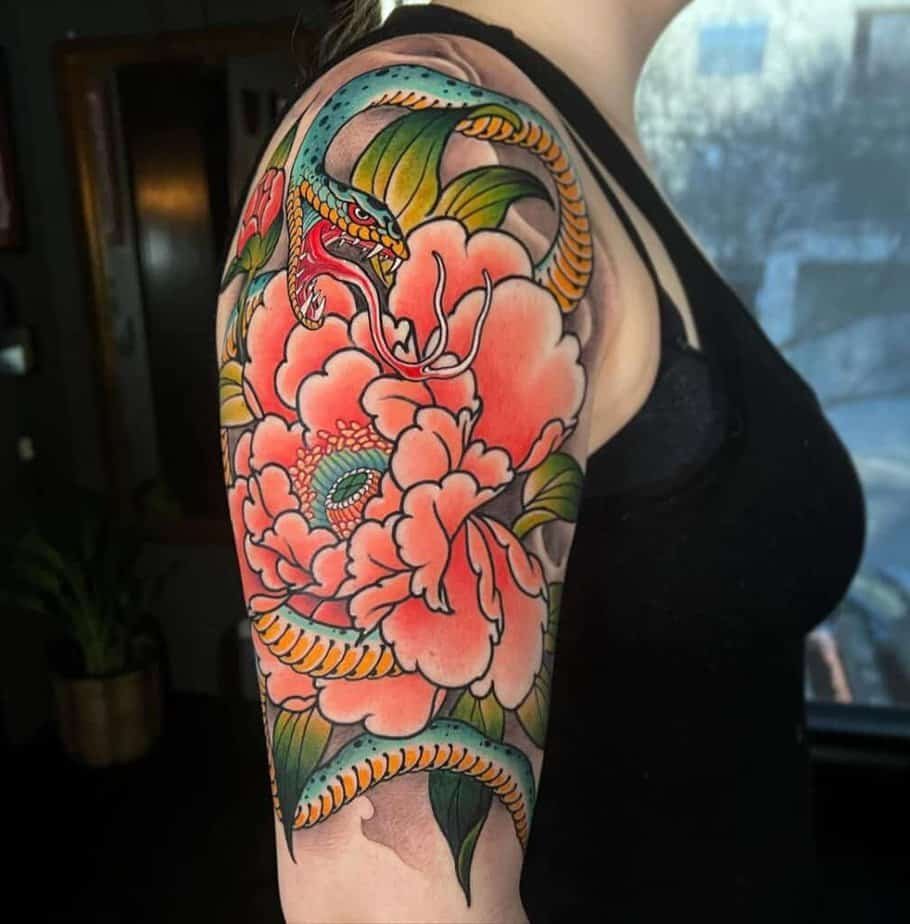 A snake wrapped around a peony is the kind of combo that reads both sensual and bold. If you want color and contrast that pops, this pairing gives you a lot of drama and visual interest.