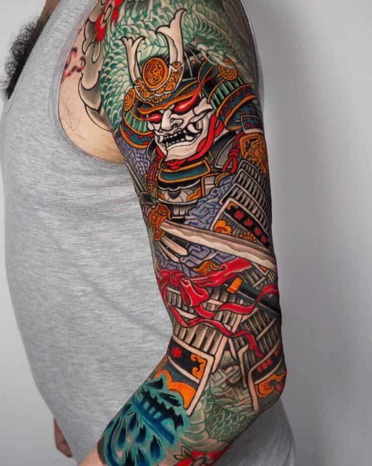 Colorful samurai sleeve — dramatic storytelling on your arm