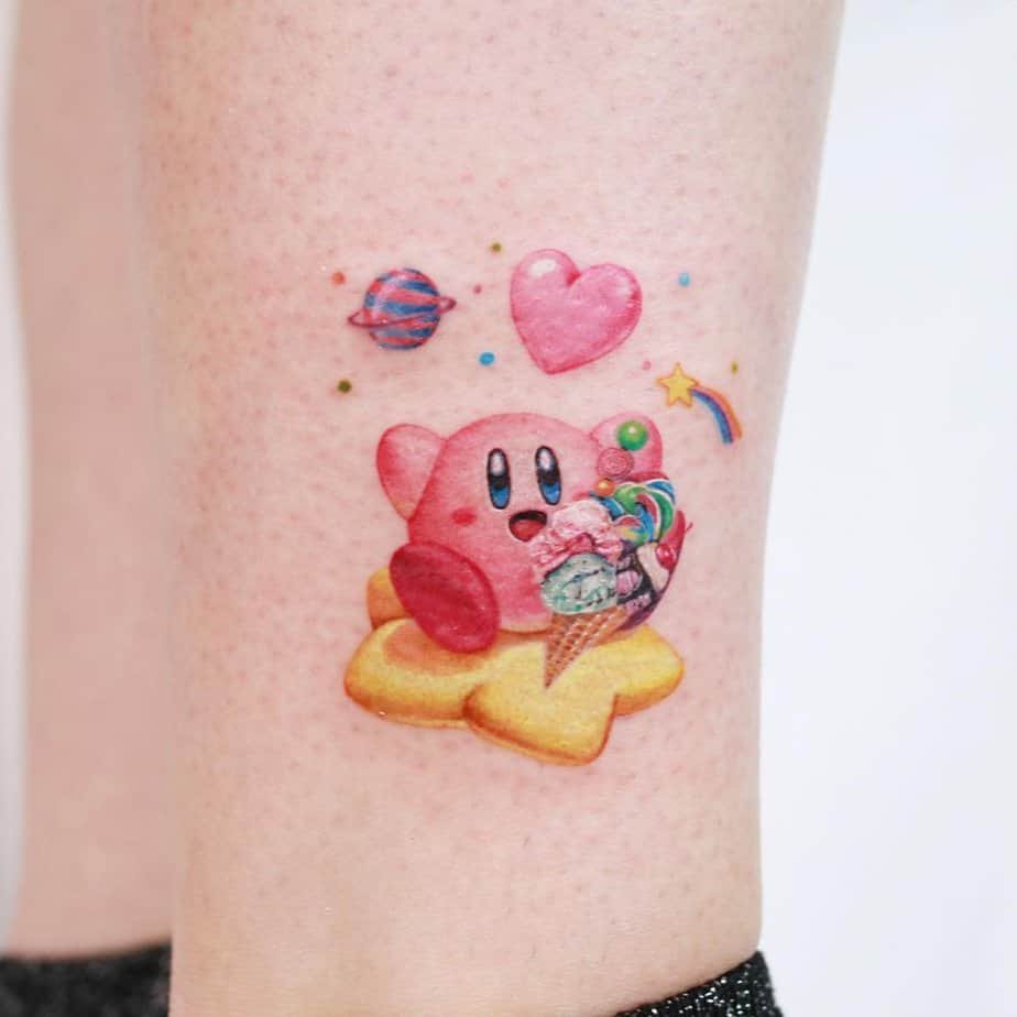 Kirby’s appetite is legendary, and this tattoo leans into that with him enjoying a burger and meat. It’s colorful, silly, and perfect if you love the food-loving, joyful side of his personality.