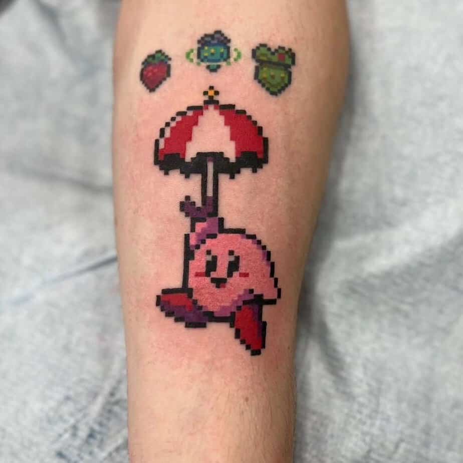 This forearm tattoo shows Kirby wielding his parasol: part shield, part attack, part gentle landing device. The umbrella’s colors pop next to Kirby and it all feels delightfully wholesome — like a bright little talisman.