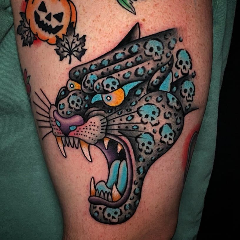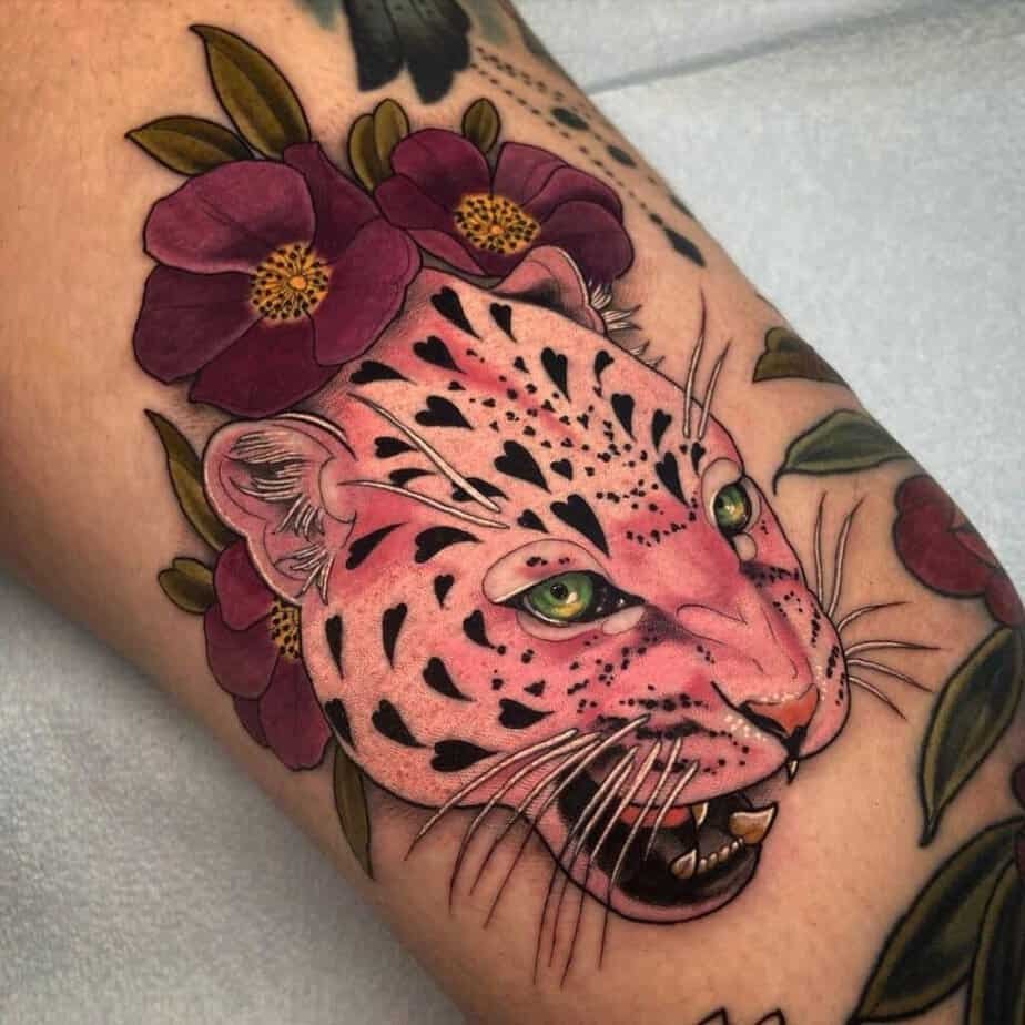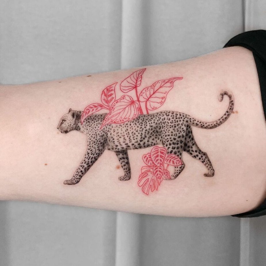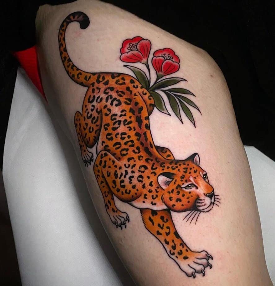 A leopard mid-leap, surrounded by bright red flowers and green leaves — it’s all movement and life. The natural elements amp up the sense of vibrancy so the tattoo feels celebratory, like a snapshot of energy in bloom.
