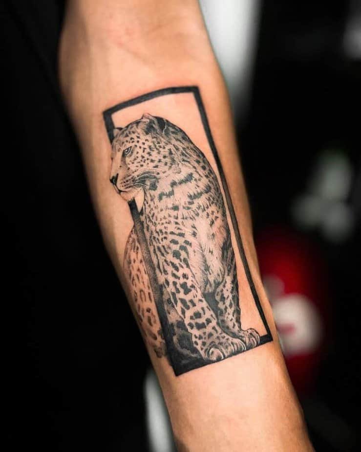 A regal leopard enclosed in a bold geometric frame — the contrast of organic fur detail against clean lines gives this forearm piece a contemplative vibe. It reads like a portrait: poised, refined, and quietly powerful.