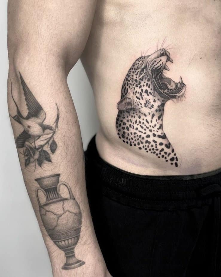 This torso tattoo freezes a roaring leopard in motion — fine shading and detail capture the raw energy and ferocity of the moment. It’s the kind of piece that feels like a mantra: fierce, resilient, impossible to ignore.