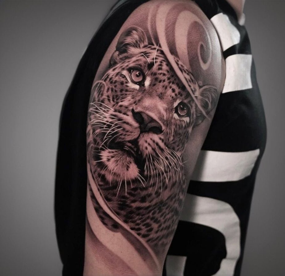 Placing the leopard’s face on the upper arm is such a flex — all those little whiskers, fur lines, and intense eyes done with fine detail make it feel uncannily alive. It’s fierce and intimate at once, a real tribute to wild energy. If you want your tattoo to feel like an emblem of inner strength, this is the kind of piece that will carry that vibe.
