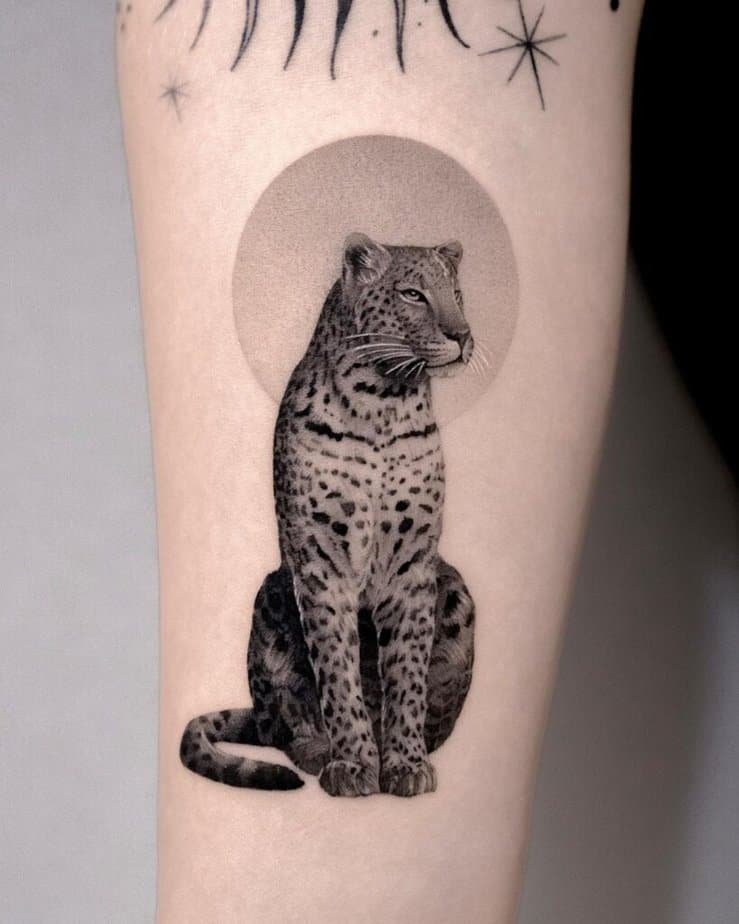 This arm piece captures a leopard mid-roar in a dramatic, arched pose — it’s pure unrestrained energy. If your spirit is loud and untamed, this tattoo will match that intensity and celebrate your fierce side.