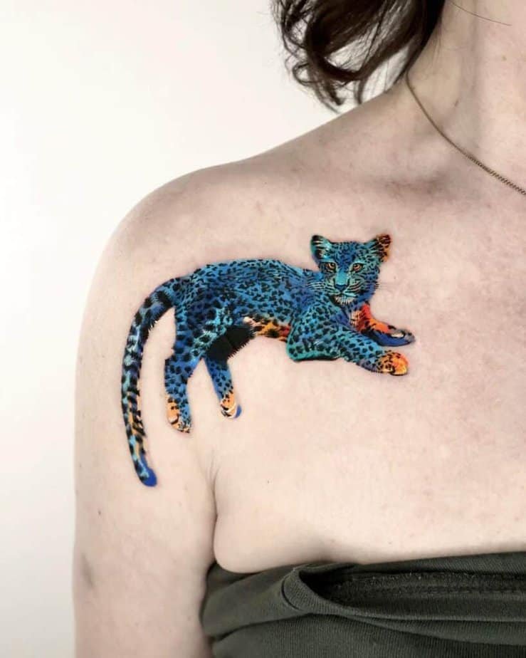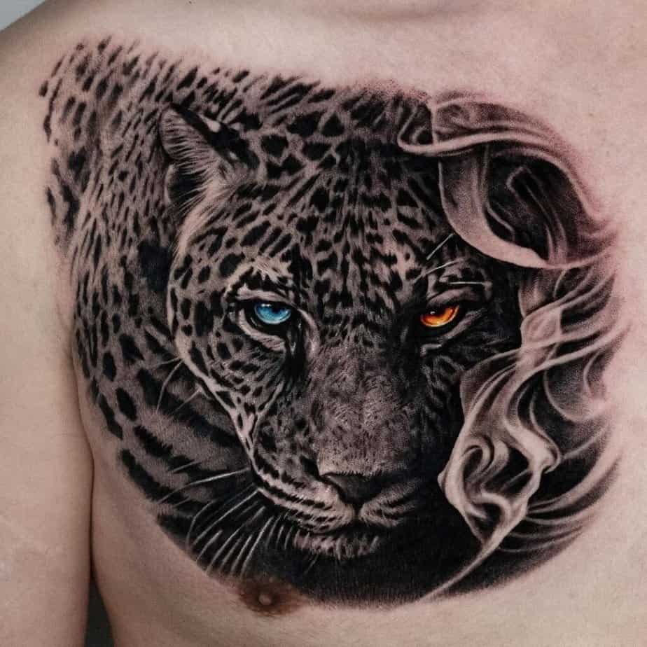 A leopard on the upper chest with multicolored eyes? Yes please. The shading and texture mimic the softness of fur, but the eyes pull you in — they’re the kind of focal point that turns a tattoo into a statement about intuition and vision. It’s moody, a little mysterious, and deeply magnetic.