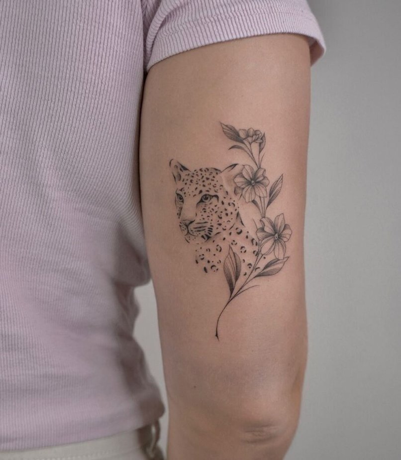 Delicate botanical elements curl around a calm leopard — it’s peaceful and refined, placed on the upper arm so it reads like a quiet cameo. This one’s for folks who prefer a tattoo that’s understated and elegant: subtle, thoughtful, and quietly captivating.