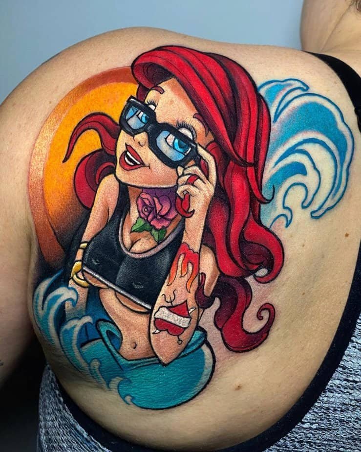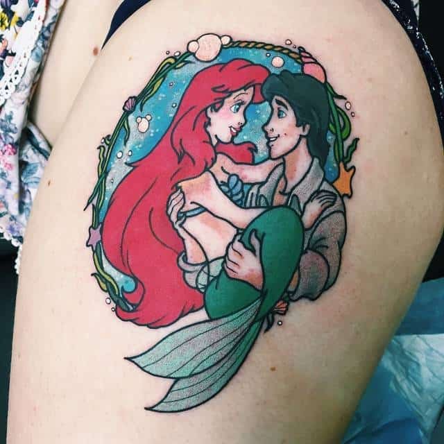 This one’s basically a hug on skin: a chibi Ariel clutching Flounder, surrounded by playful bubbles. It’s bright, childish in the best way, and just radiates joy. If you want a tattoo that feels like summer and a Saturday morning cartoon, this is it.