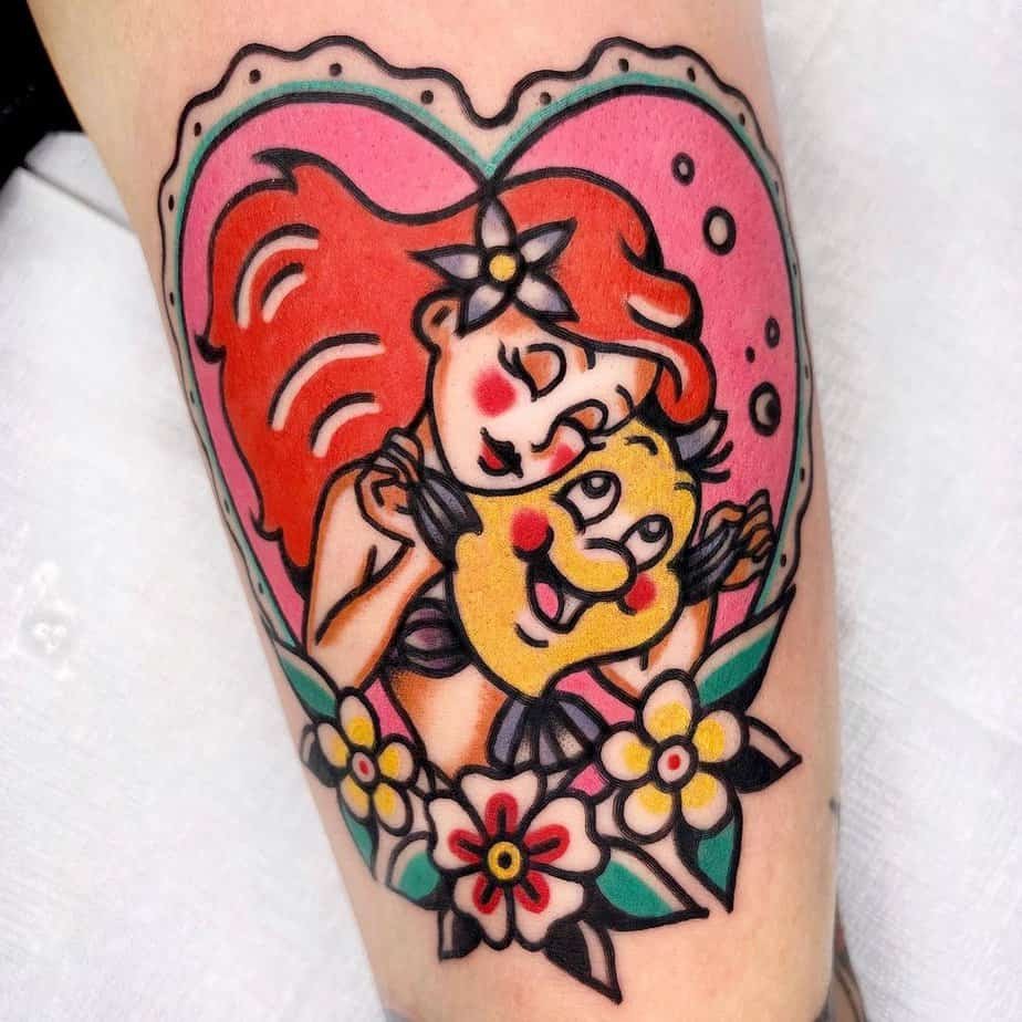 Rendered in a timeless traditional style, this tattoo shows Ariel hugging Flounder inside a heart-shaped frame with a hot pink background and flowers below. It’s bright, bold, and all about that forever-friendship energy.