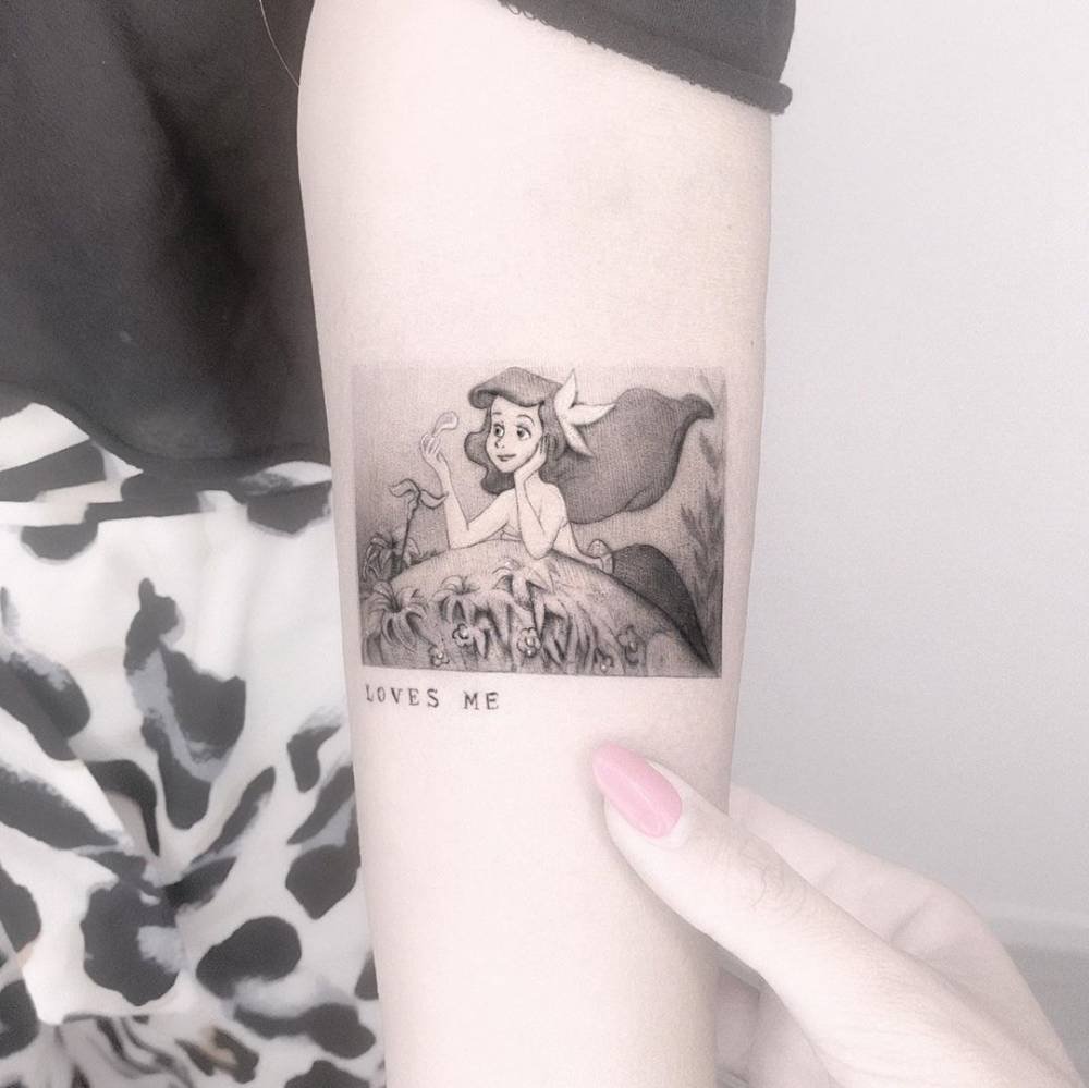 A tiny, delicate single-needle piece shows Ariel daydreaming as she plays the "loves me, loves me not" game. The subtle black-and-gray lines and the inscription "loves me" underneath make it tender and quietly hopeful — a little love note etched into skin.