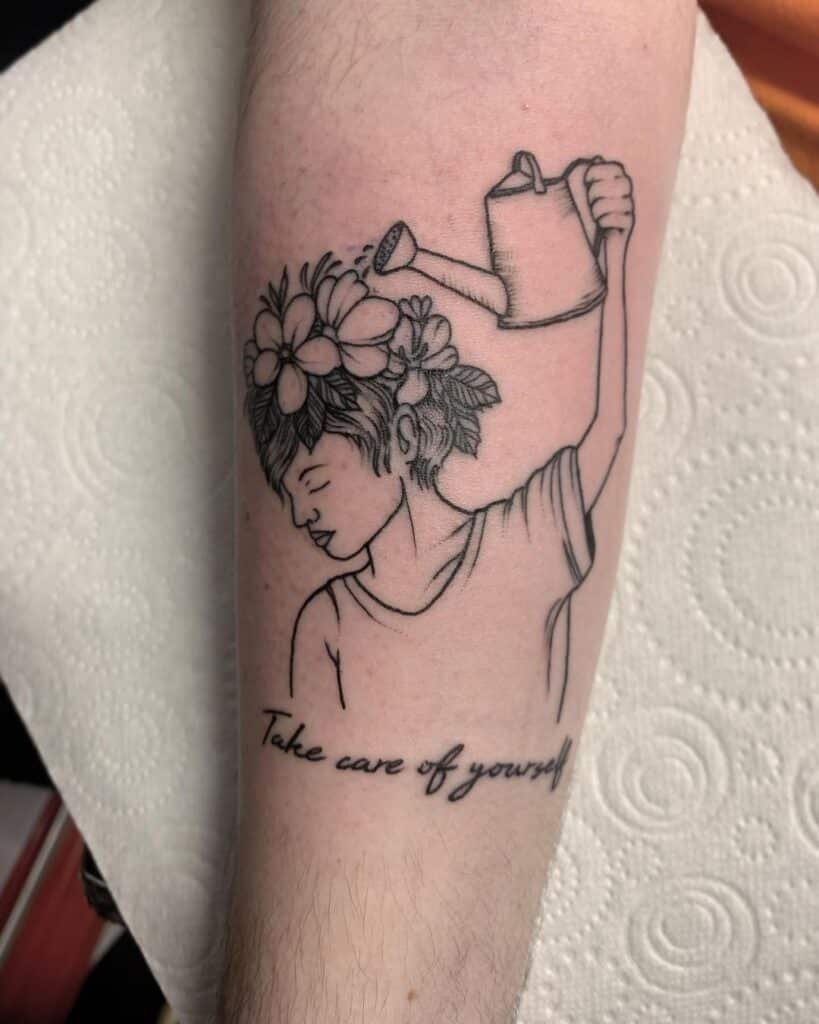 Even the most beautiful blooms need tending. This tattoo is a sweet reminder to water your mind and body, to prioritize care even when life feels busy or chaotic.