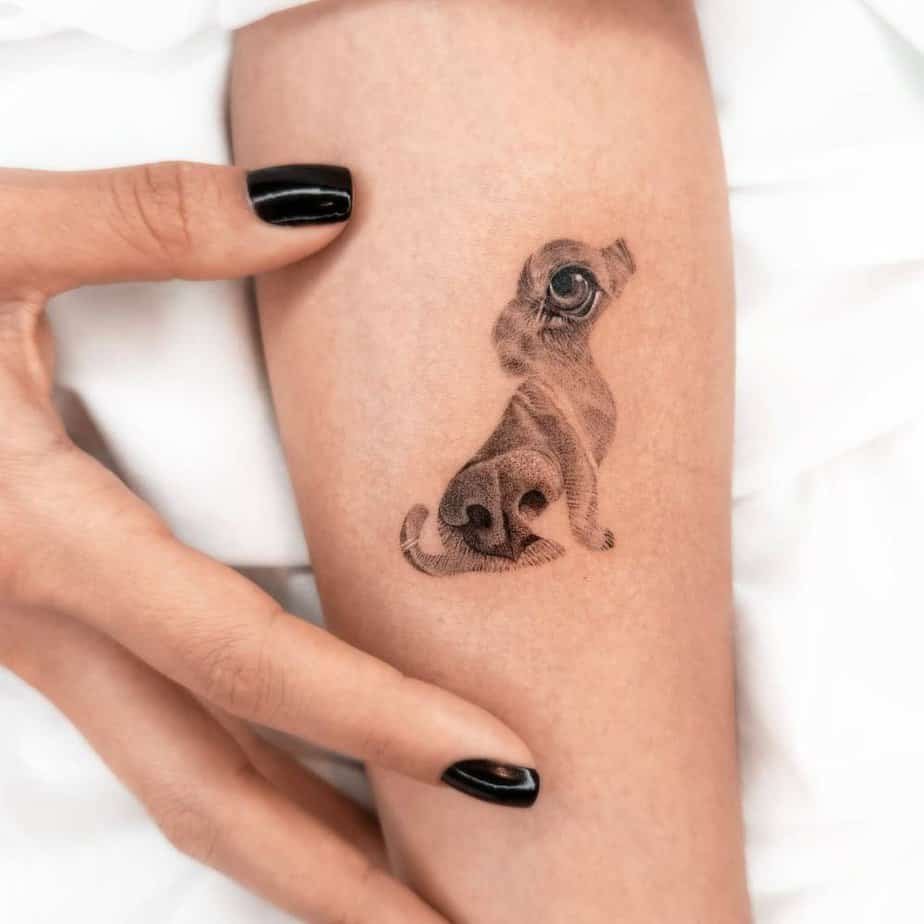 Okay so this forearm piece is genius: the silhouette reads like a dog at first glance, but the lower shape becomes a snout and the top reveals an eye — it’s almost like the outline is a secret portrait. The detail is so crisp you really feel the gaze, which is why this kind of tattoo hits so hard for dog lovers. It’s sweet, clever, and low-key emotional all at once.