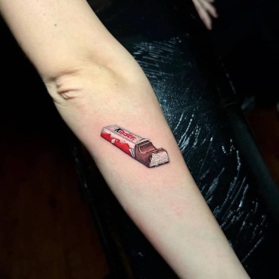 Who doesn’t remember ripping open a Kinder as a kid? This little wrapper-and-cream tattoo is basically edible nostalgia — a sweet reminder to hold onto playfulness and joy even when life gets serious.