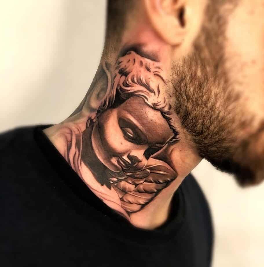 A cherub on the neck feels like carrying innocence and sensitivity close to you. It’s tender and evocative — a little statue brought to life in ink, channeling warmth, protection, and a pinch of wistfulness.