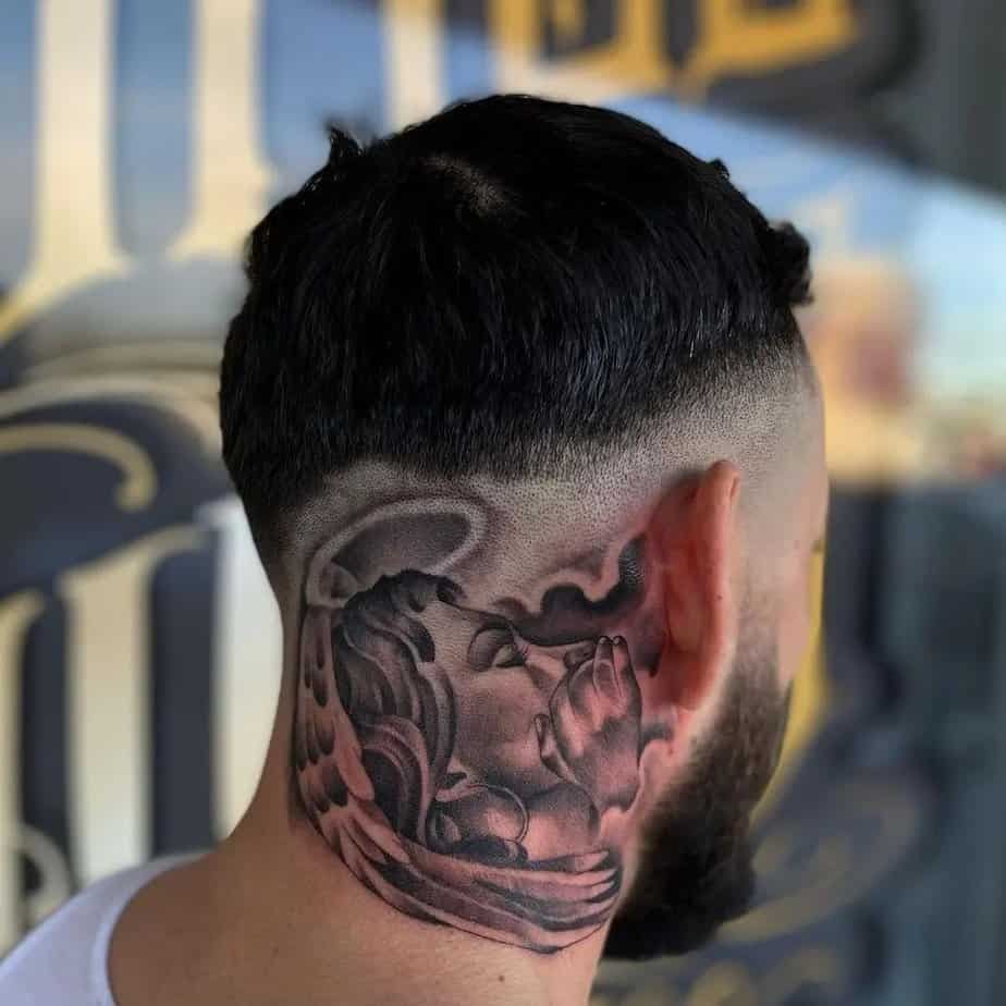 An angel with outstretched wings that even reach the hairline — add cracked-earth details and you’ve got something cinematic. This one reads protective and powerful, a visual story about strength, spirituality, and presence.