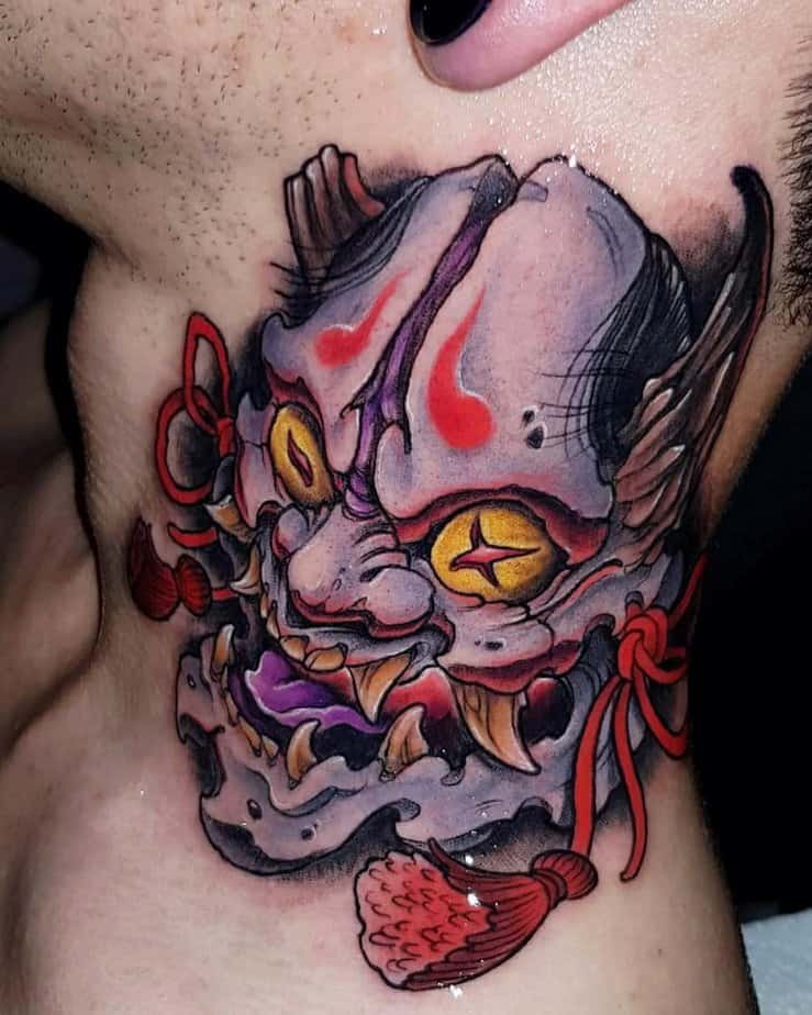 The Hannya mask is intense — bright colors, fierce expression, and a lot of cultural weight. Traditionally tied to protection and warning against negativity, it’s a spectacular, symbolic option if you want color with meaning.