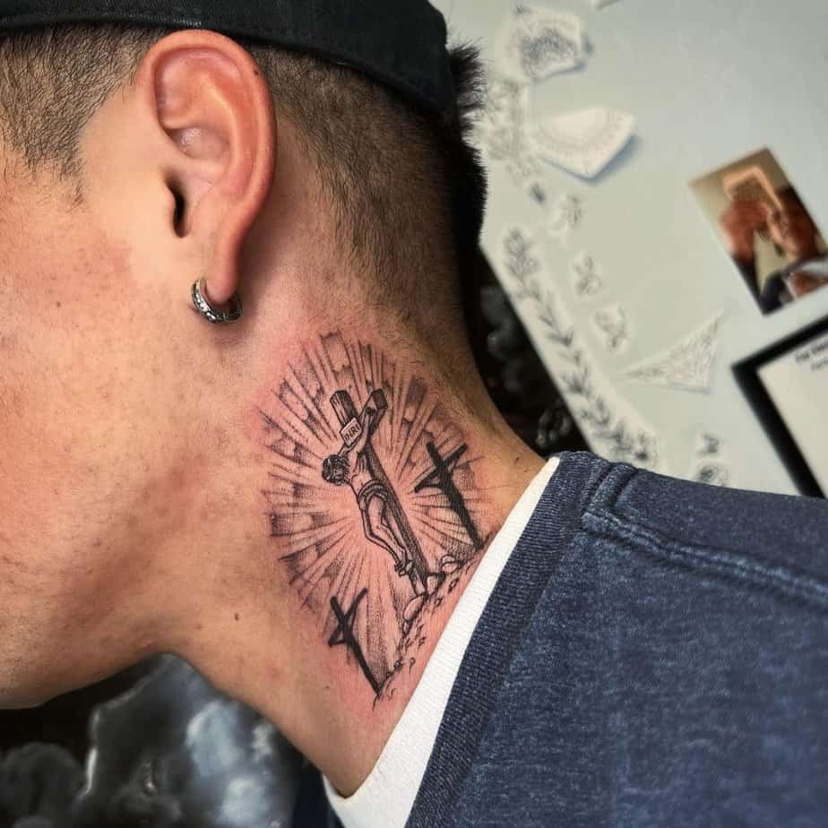 A scene of Jesus on the cross, lit toward the sky, carries weight and reverence. It’s a tattoo that speaks to faith, sacrifice, and spiritual light — very much a personal and solemn emblem.