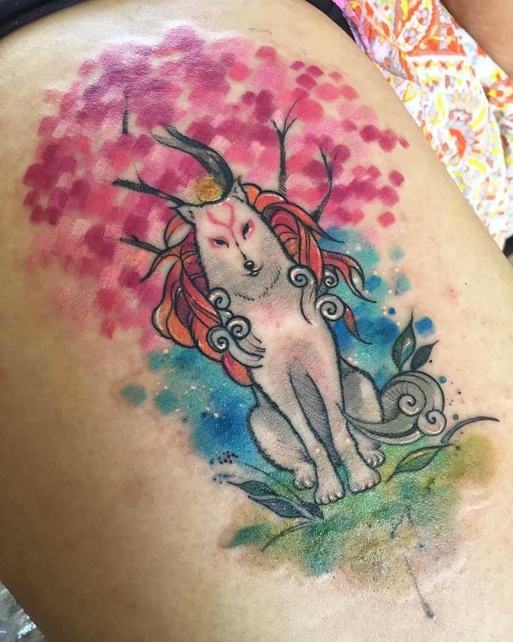 This thigh tattoo mixes beauty with power: Okami among the nature it restored, with cherry-blossom shapes calling back to the Cherry Bomb ability from the game. That move is fierce, but it’s also a symbol of protecting nature — so the design balances strength with tenderness in a really lovely way.