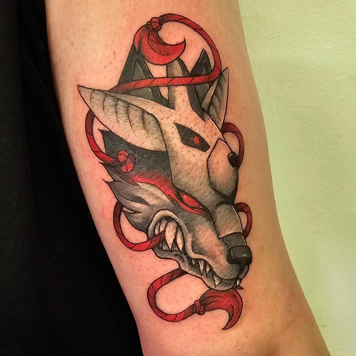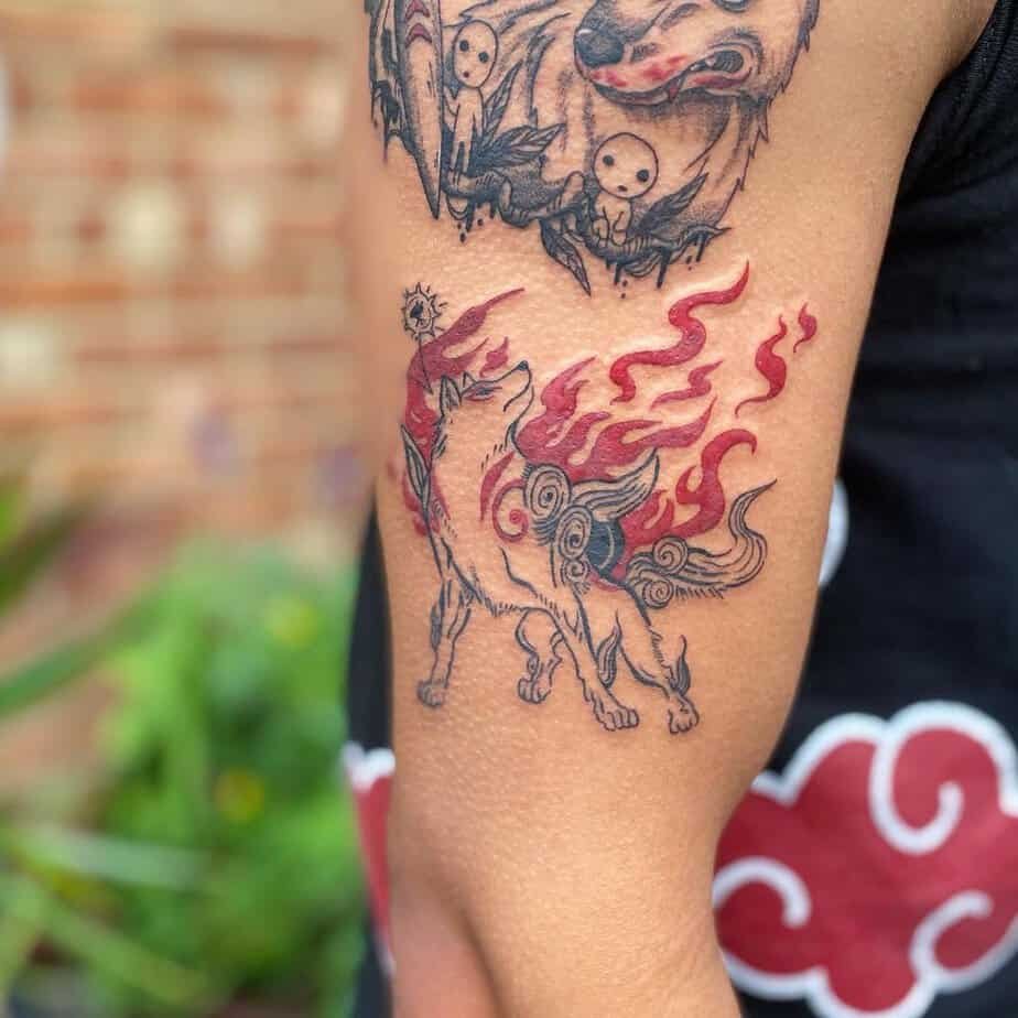 This upper-arm tattoo catches Okami mid-run, howling, full of fire and intent. The bright red drives home Amaterasu’s essence — fearless, focused, and protective. It’s the kind of piece that says you’ll stand your ground.