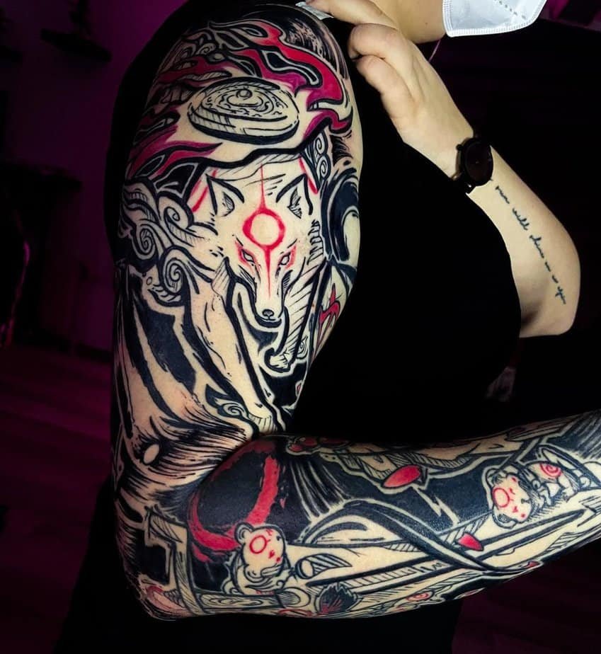 If you want something that lands with a flourish, a full sleeve does it. This one folds Okami into an entire story across the arm, mostly black with red accents, so it reads intense and cinematic. It’s the choice for people who want the art to speak loudly and mean something.