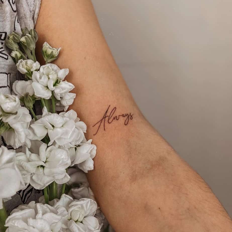 Always could be a vow, a memory of someone, or a pledge to yourself to stay true. It’s flexible and quietly powerful, especially when placed where you can glance at it and remember why you chose it.
