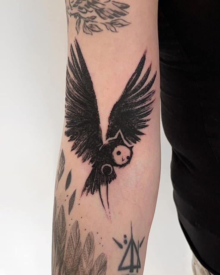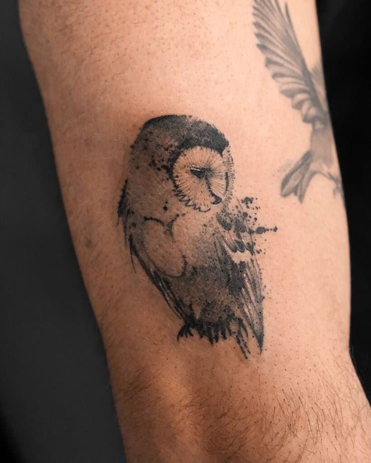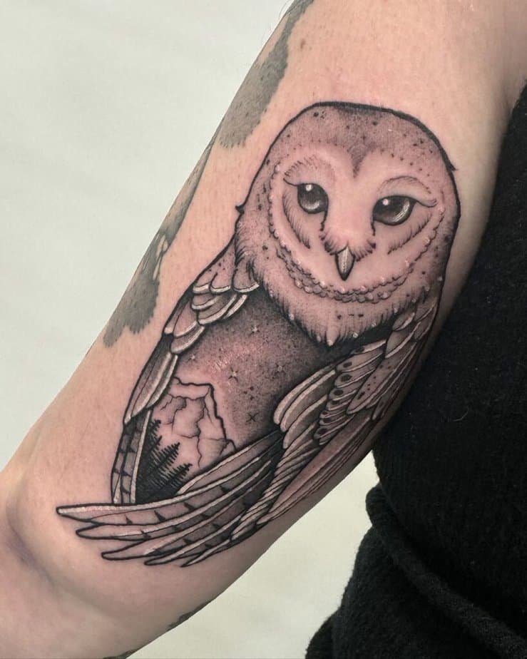 If you like something classic, black-and-gray is such a timeless move. Think of a tiny owl that doesn’t try to outshine anything — it’s there to guide, not to perform. Owls can twist their heads in wild ways, so there are no strict rules about shape; you can lean into whatever feels organic for the placement. Imagine an owl whose body contains a little landscape — mountains and trees tucked into the silhouette — wings that look like they’re sheltering a whole forest. Or picture a realistic piece where the textures are all about shadow and dark patches, but the eyes have a tiny pop of color that gives everything an eerie, beautiful glow.