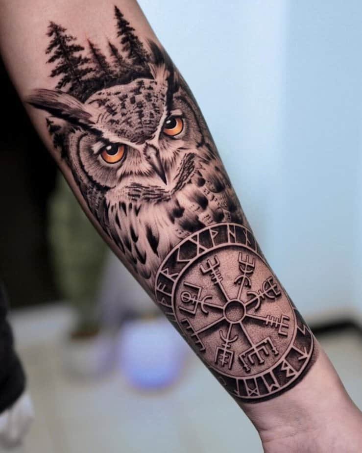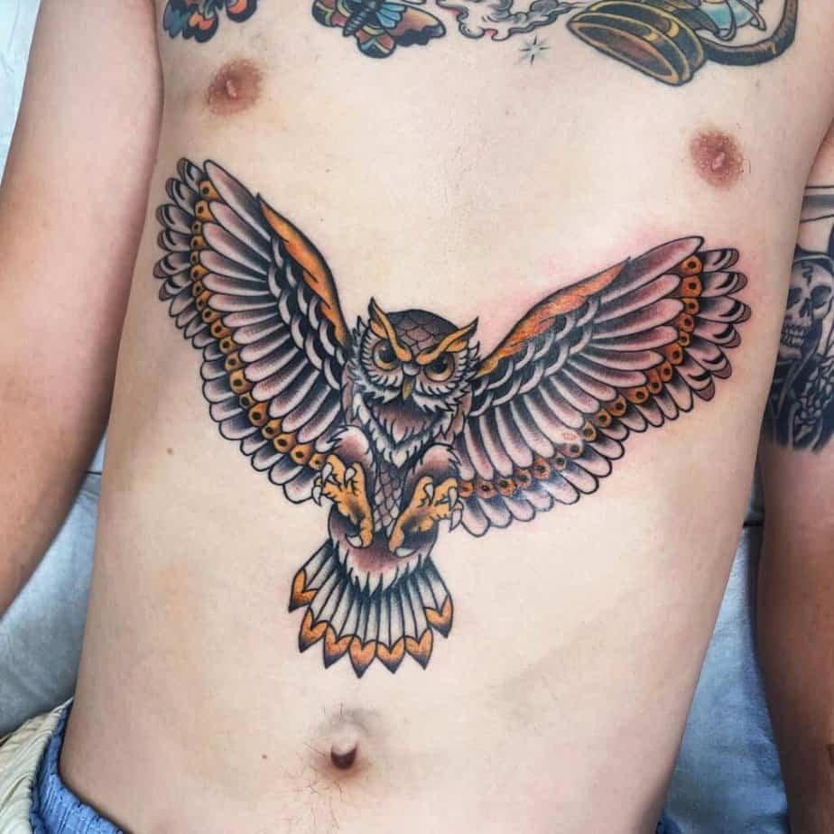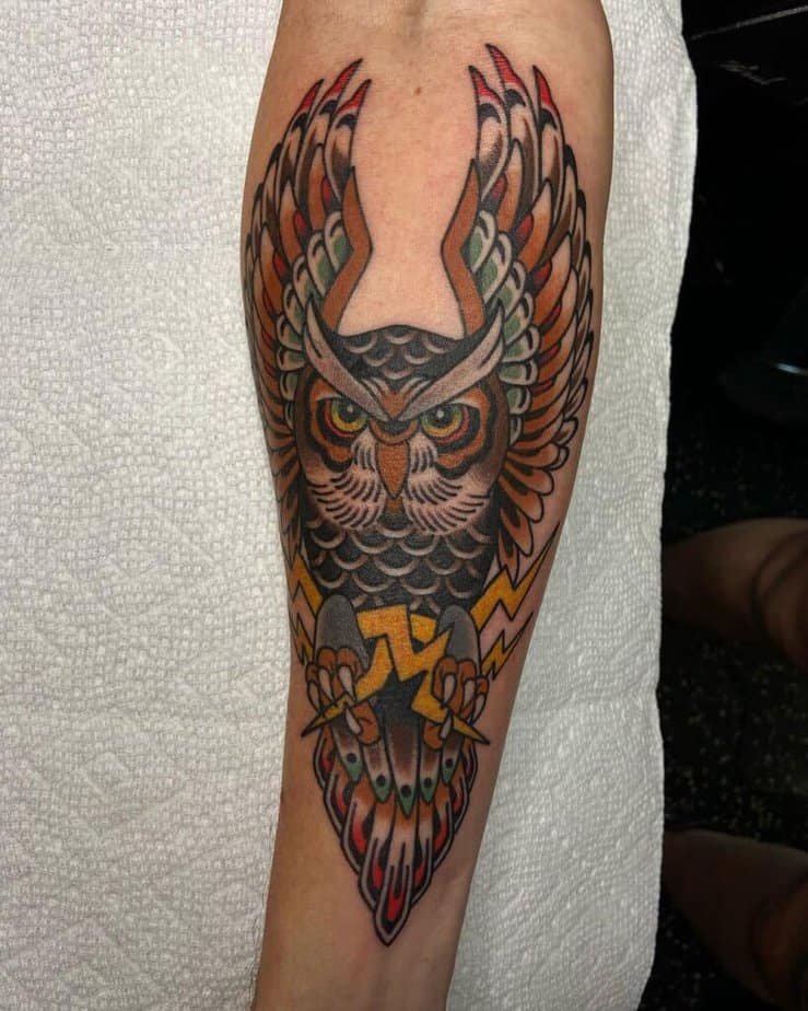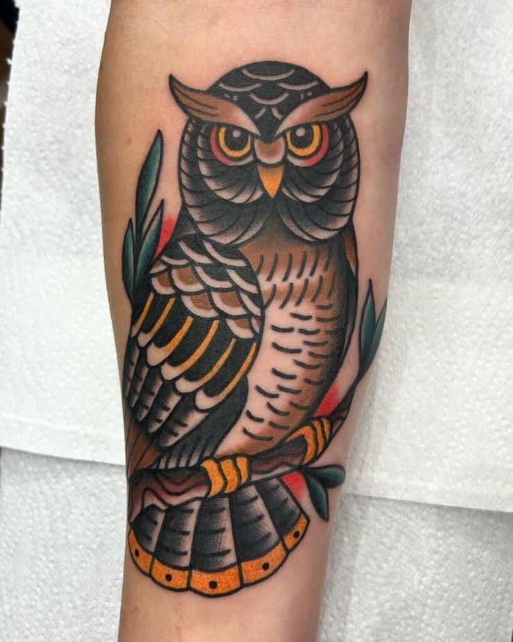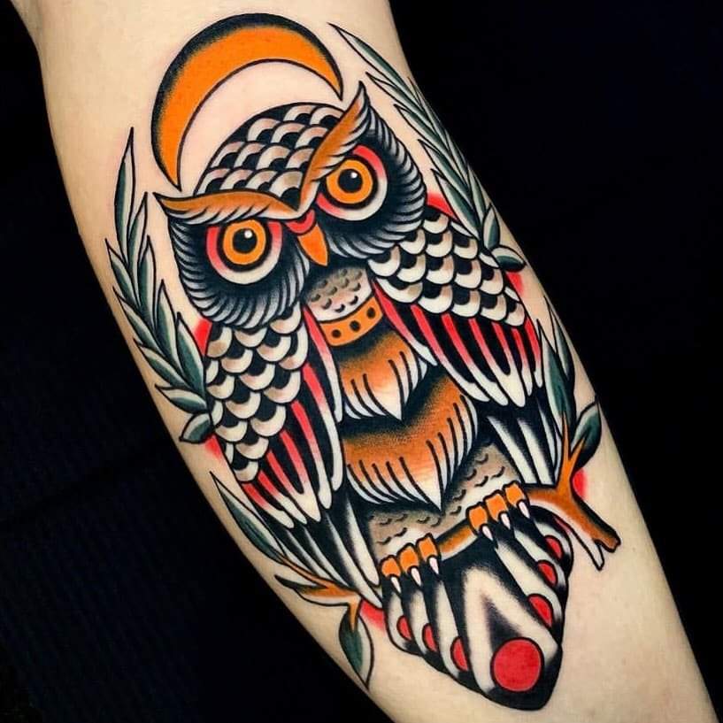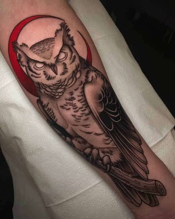 If you’re into thick outlines, saturated color, and something that reads instantly as a tattoo — traditional style might be your jam. These owls have big personalities: the head shape might be a little stylized, a branch underfoot, bold reds in the background for extra punch. Go extra big and have an owl with spread wings across your chest so there’s room for detail, or let a darker traditional piece flow down the forearm — deep, juicy colors, strong lines.