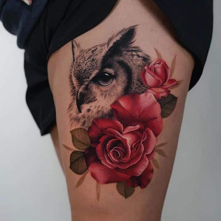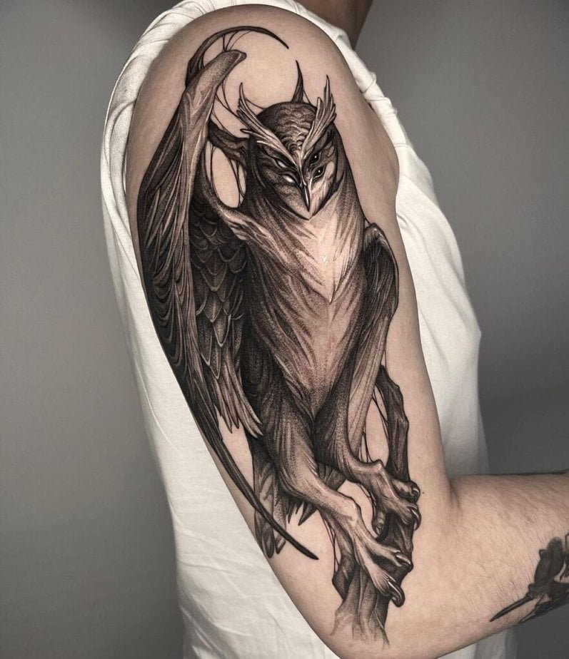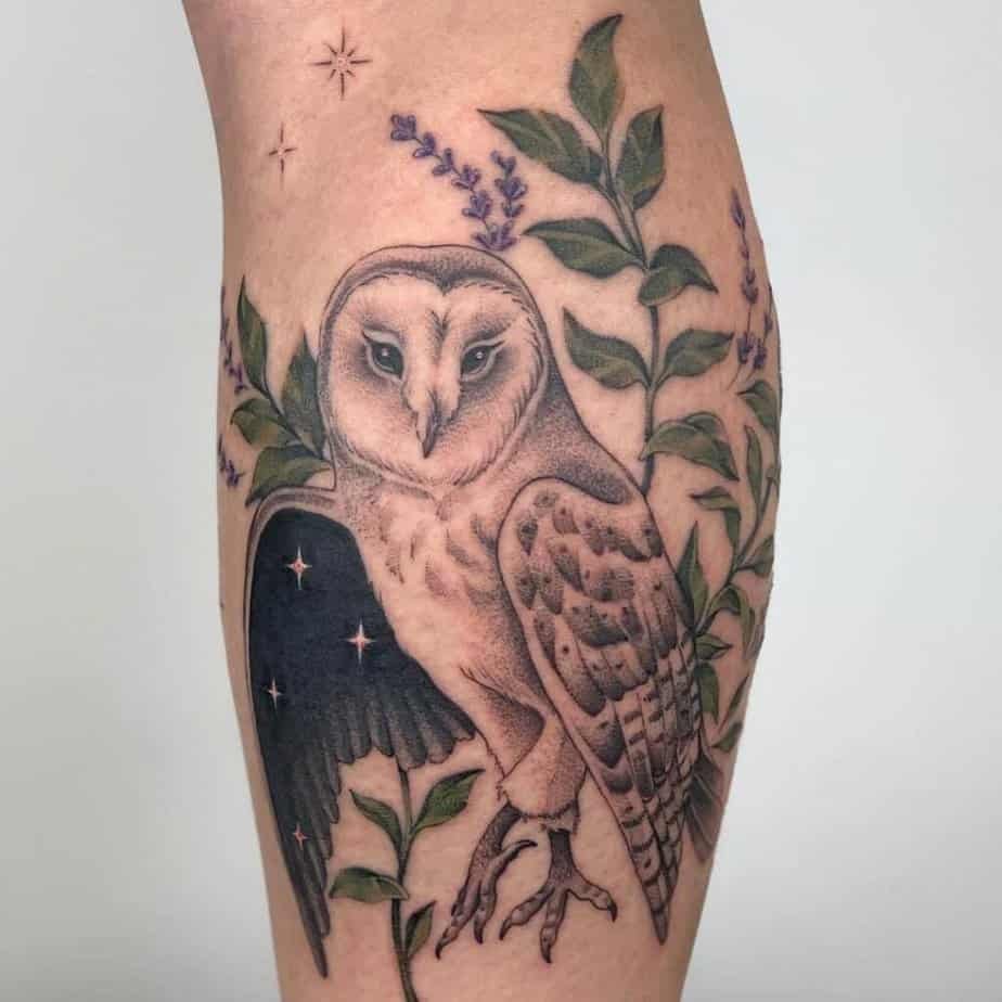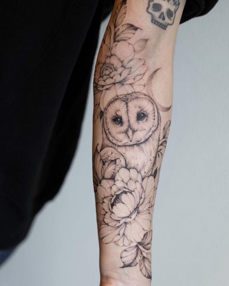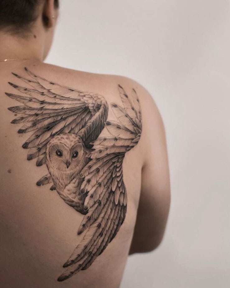 Sometimes owls in motion are the most magical — wings spread like they popped out of a fairy tale and landed straight on your skin. Composition that follows the curve of your body makes those wings look like they belong there. Other black-and-gray pieces sprinkle in flowers and use negative space so the skin peeks through — it adds softness and depth. And if you want something a bit more ethereal, there are white-owl vibes with shadings, blacked-out wing segments, and tiny stars that feel like they’re telling their own story. Oh, and if you love mixing styles, you can combine tribal elements and rich shadows for a piece that’s dimensional and slightly mysterious.