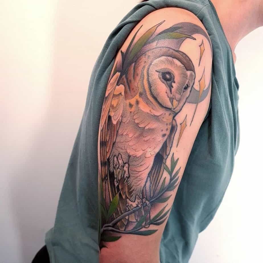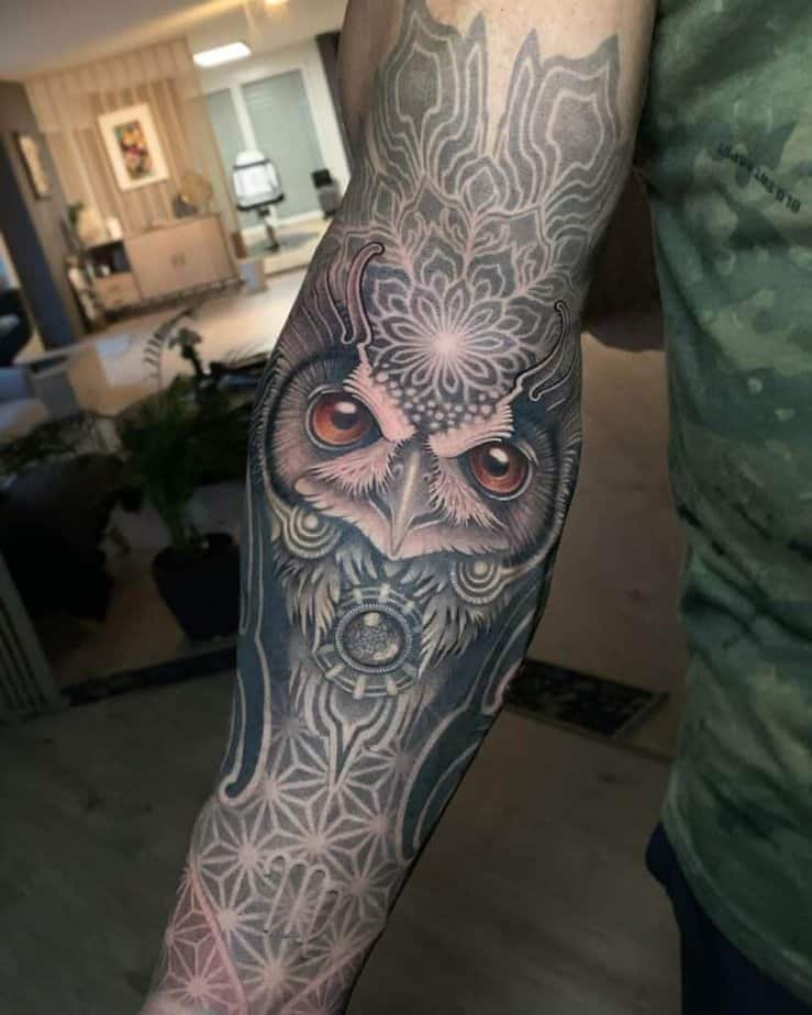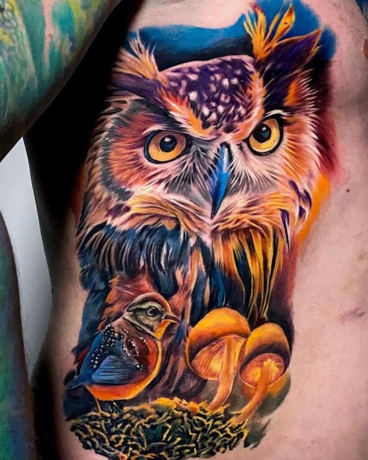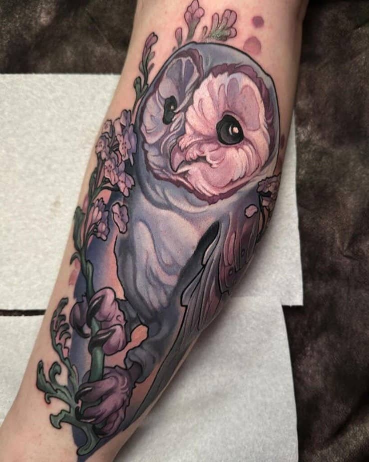 Who said owls have to be moody? Watercolor owls are gorgeous — think washes of color, soft petals underfoot, and hues that blend like a little nightlight on your skin. If you want vibrant, these designs make your heart feel lighter; some pieces look like moonlight hitting a colorful feathered friend. There’s often an absence of heavy outlines, but the textures are still crisp and intentional. Add moons, stars, and leafy greens to elevate that mystic, dreamy energy — and you’ll end up with something both playful and spiritual.