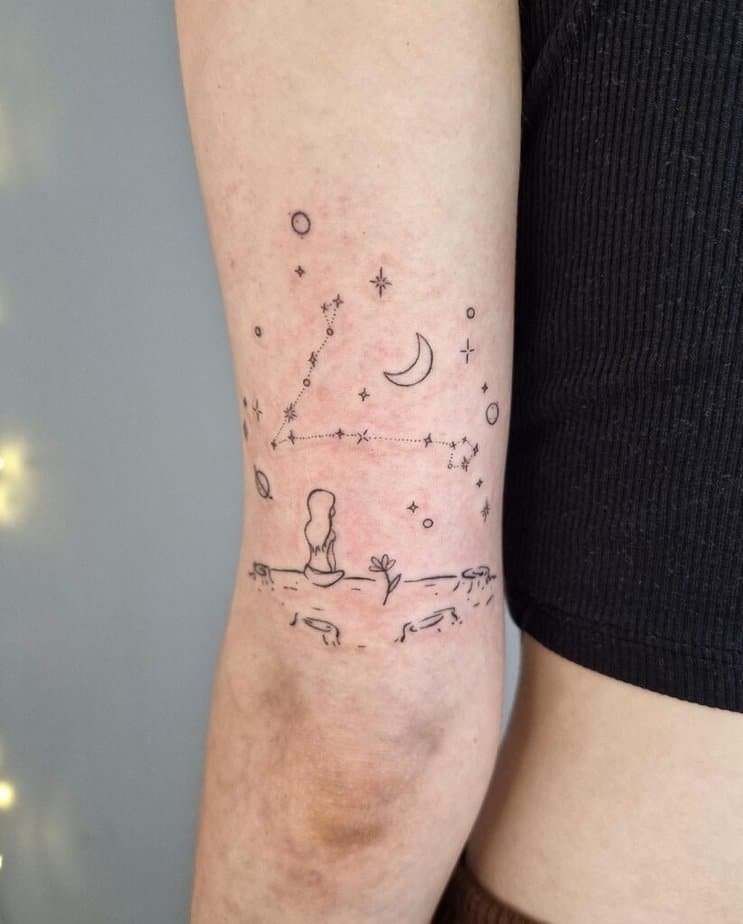 Constellation tattoos feel like little maps to your inner universe. On the back of the arm they’re playful, airy, and easy to pair with tiny stars, dots, or other little motifs that make it yours.