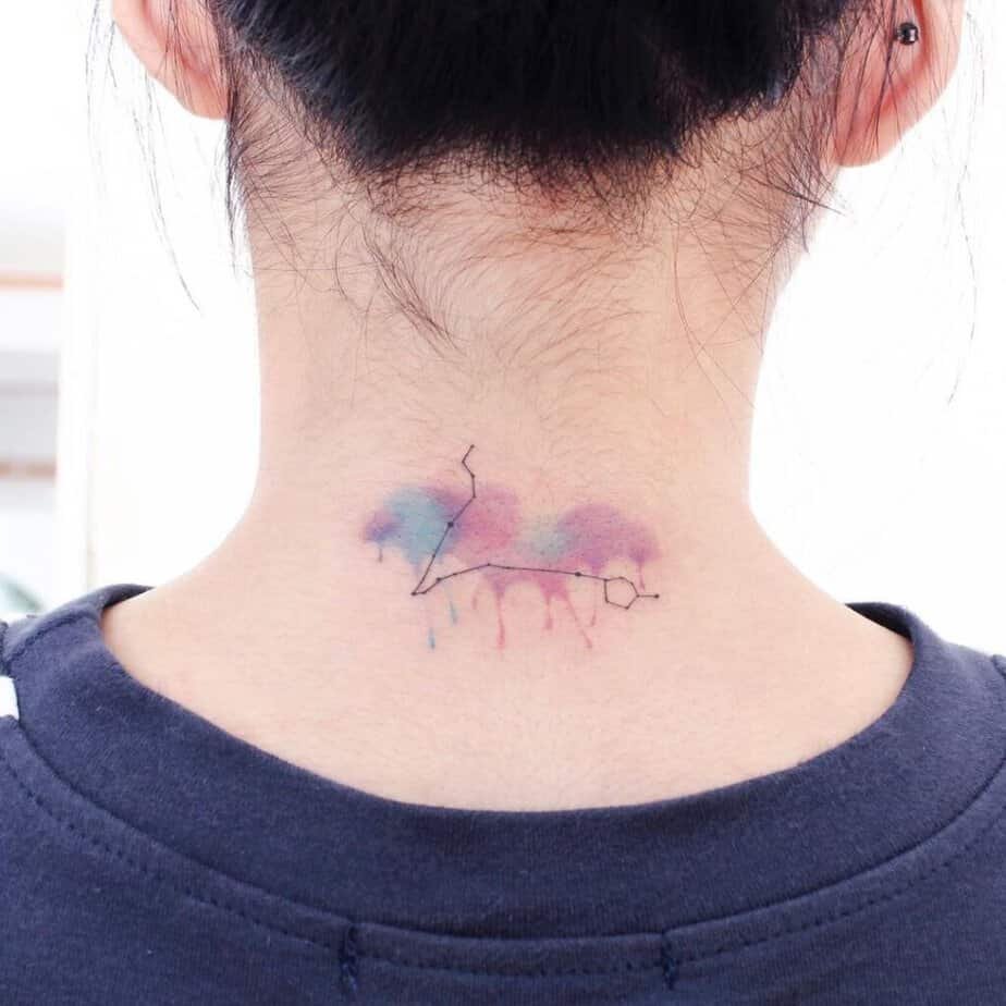 Watercolor tattoos feel like real paintings on skin — splashes, washes, and color that don’t obey boundaries. At the back of the neck, a watercolor Pisces reads like a soft statement: artistic, free, and a little ethereal.