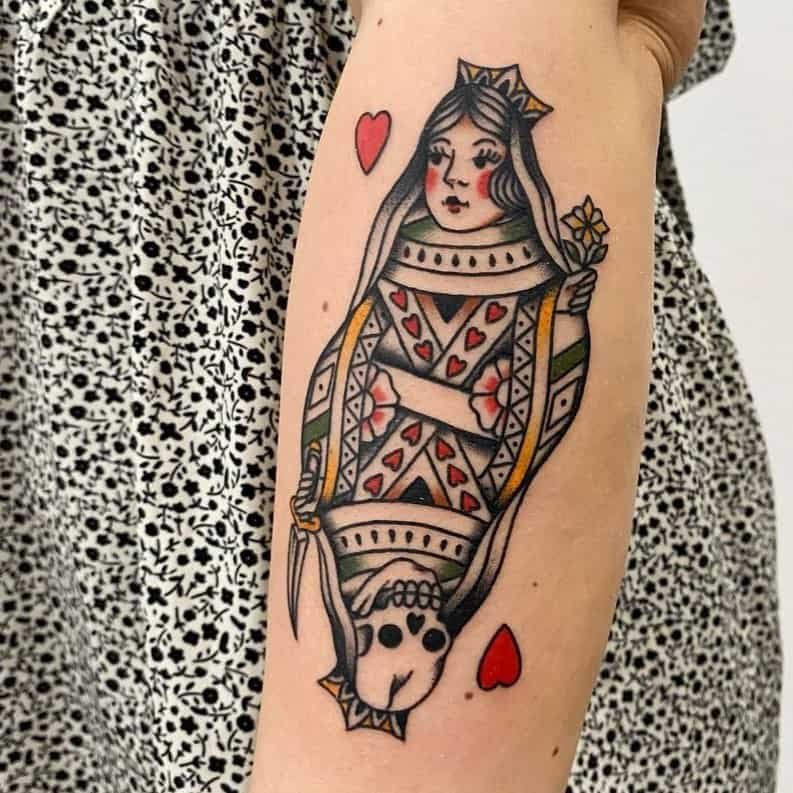 I’m low-key obsessed with this surreal take: a hand cradling the Queen of Hearts like a secret. It reads as protective and mysterious, like keeping your power in your pocket until it’s needed. The mix of surreal elements with classic tattooing gives it a thoughtful, storybook energy.