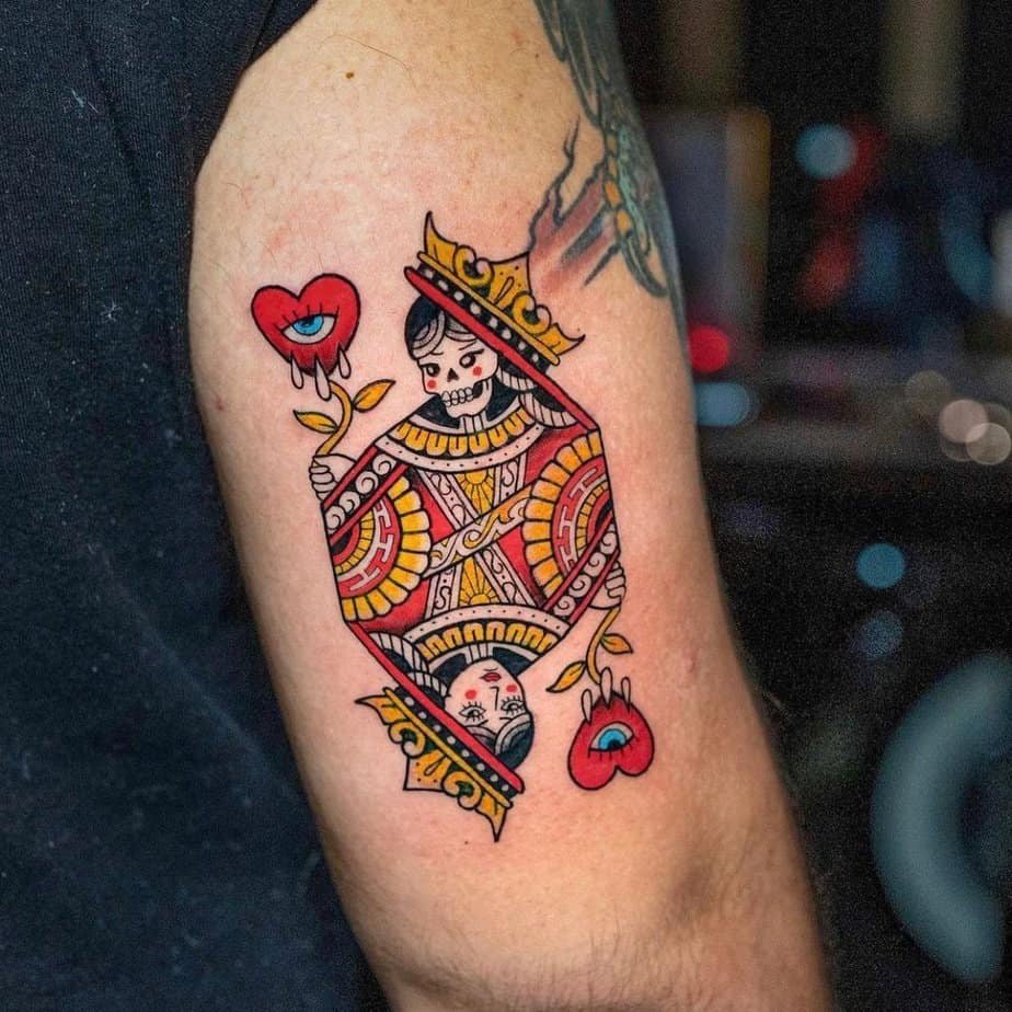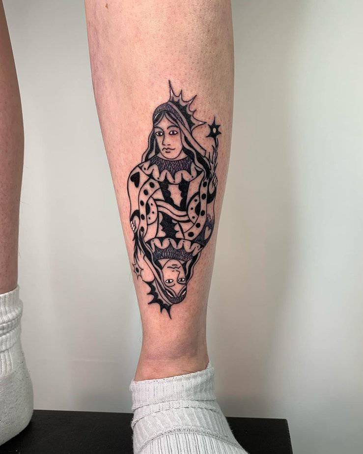 I’m low-key obsessed with this surreal take: a hand cradling the Queen of Hearts like a secret. It reads as protective and mysterious, like keeping your power in your pocket until it’s needed. The mix of surreal elements with classic tattooing gives it a thoughtful, storybook energy.